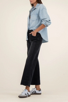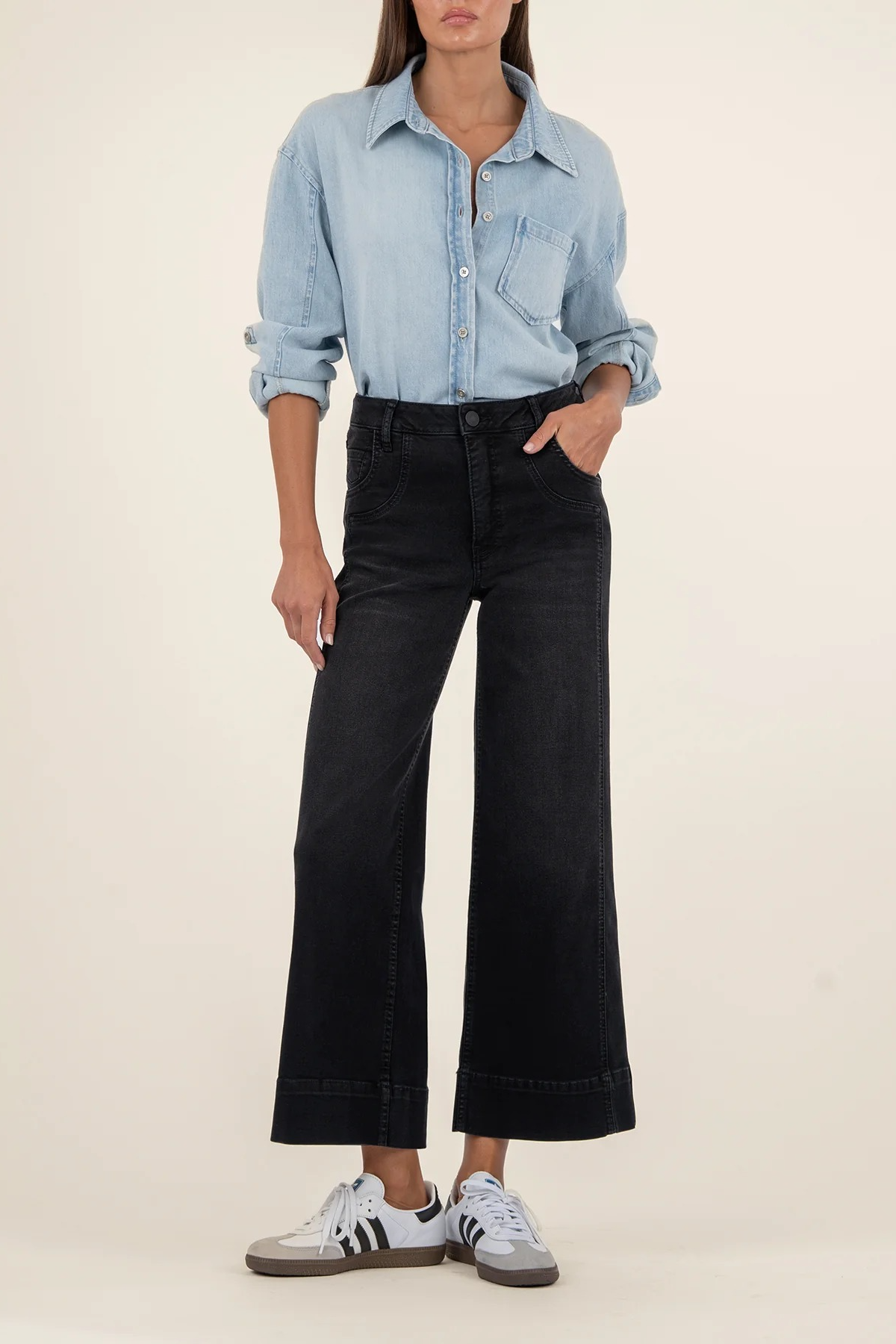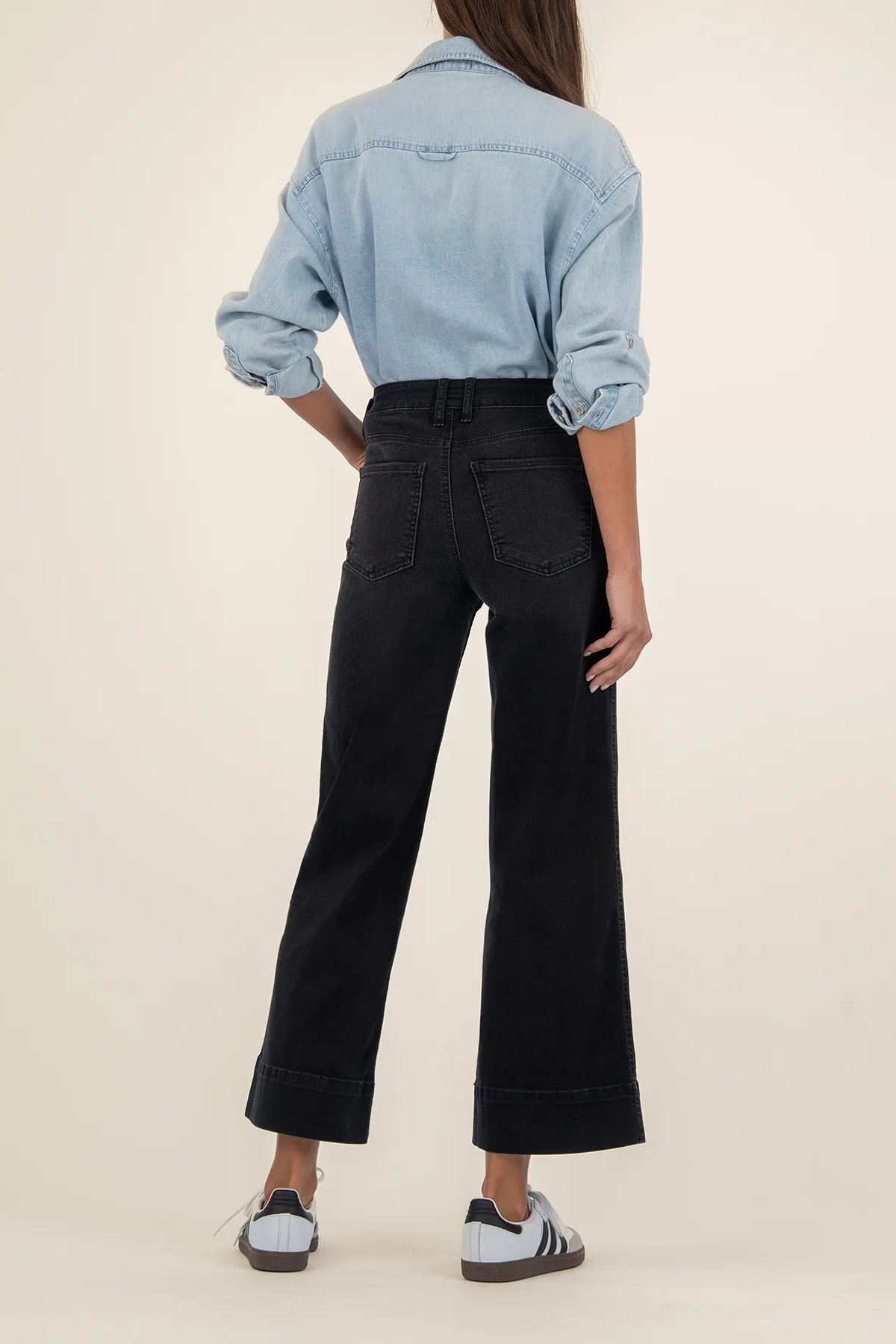 "These high-rise wide-leg jeans are crafted to enhance your shape with a sleek black wash and soft, stretchy fabric for all-day comfort. The Fab Ab front pockets, double pocket design, and wide hem create a contemporary look that balances structure with effortless style.