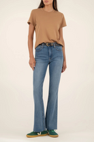 Make a statement in these high-rise flare jeans, designed in a vintage-inspired medium wash with Fab Ab technology for a sleek, flattering fit. A raw hem lends a touch of edge, while the super-stretchy fabric ensures effortless comfort and movement.