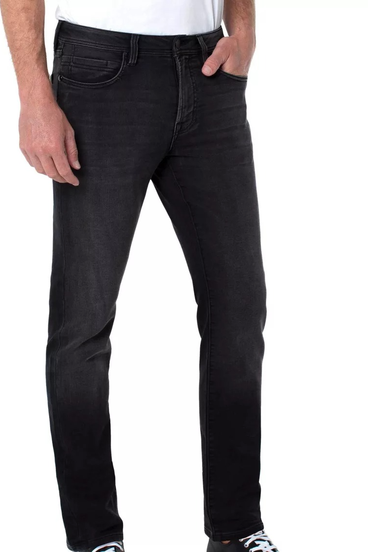 The Kingston Modern Slim Straight Jeans in Bleecker from Liverpool feature a black wash denim with 360 stretch. Benefit from the look of denim with the comfort of knit. 360 degrees of stretch retract back without bagging or buckling. These jeans allow full range of motion with ZERO boundaries. This modern slim straight pant is the perfect go-to for any man looking for versatility and ease. The slim construction offers a perfectly balanced fit without being too tight or loose. These pants have classic five-pocket styling details, a set-in waistband with belt loops and a zip-fly with a single logo button closure.
