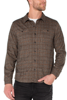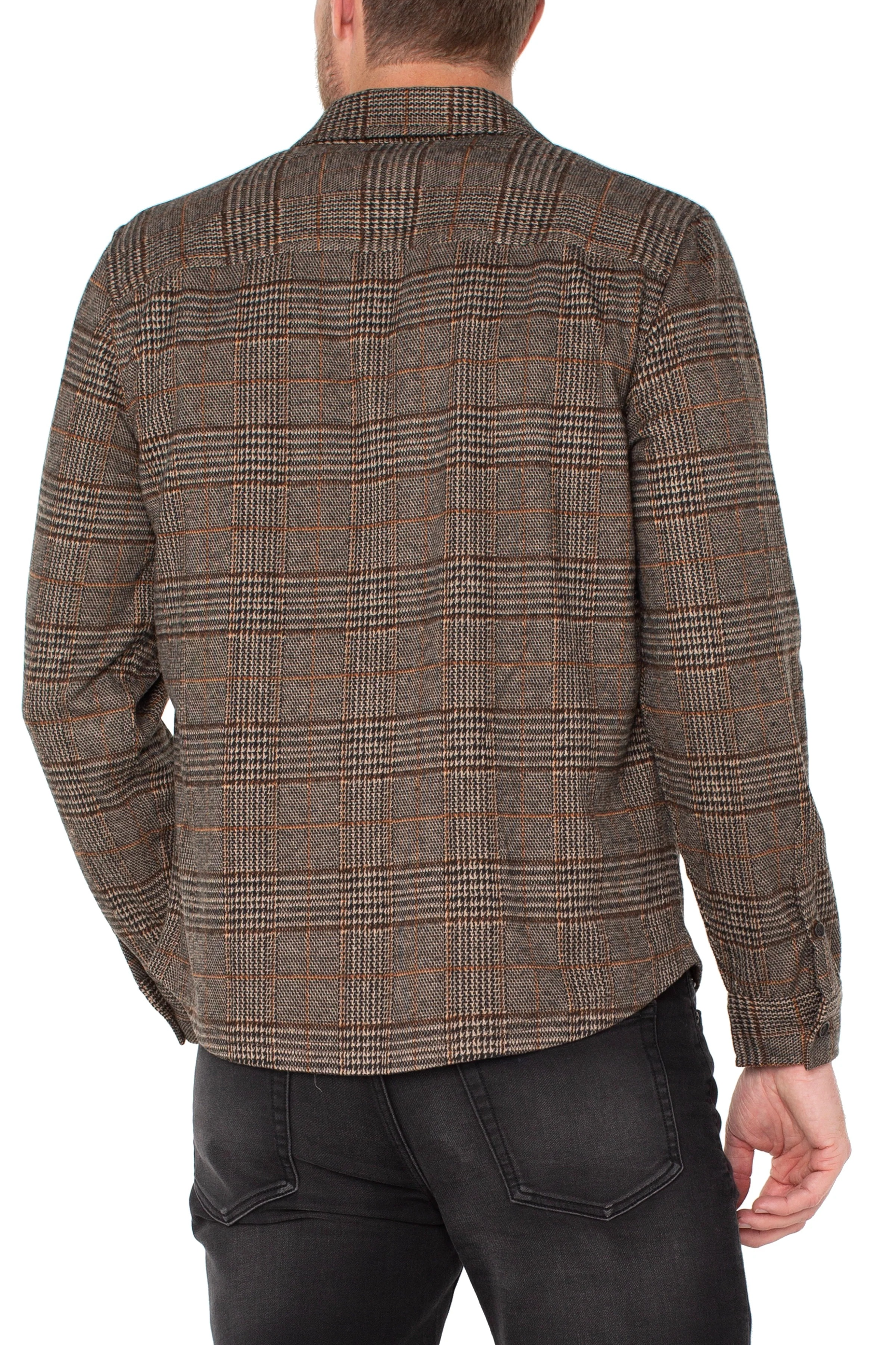 "Built for comfort with a touch of rugged charm, this knit long-sleeve button-up is made from brushed plaid jacquard knit, offering rich texture and a soft, lived-in feel. The taupe, black, and rust color mix adds a versatile look that pairs easily with denim, chinos, or layers perfectly under a jacket.