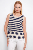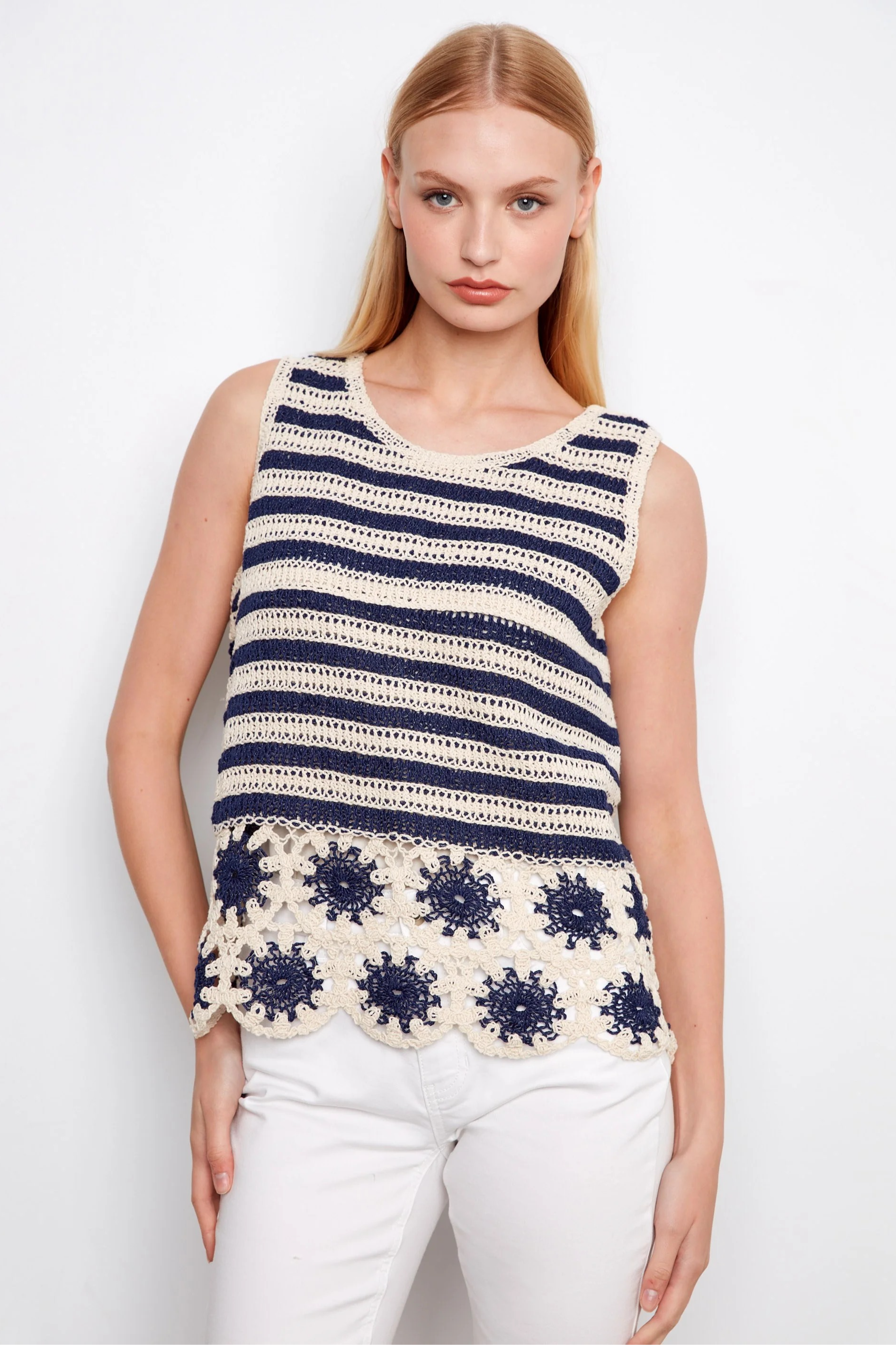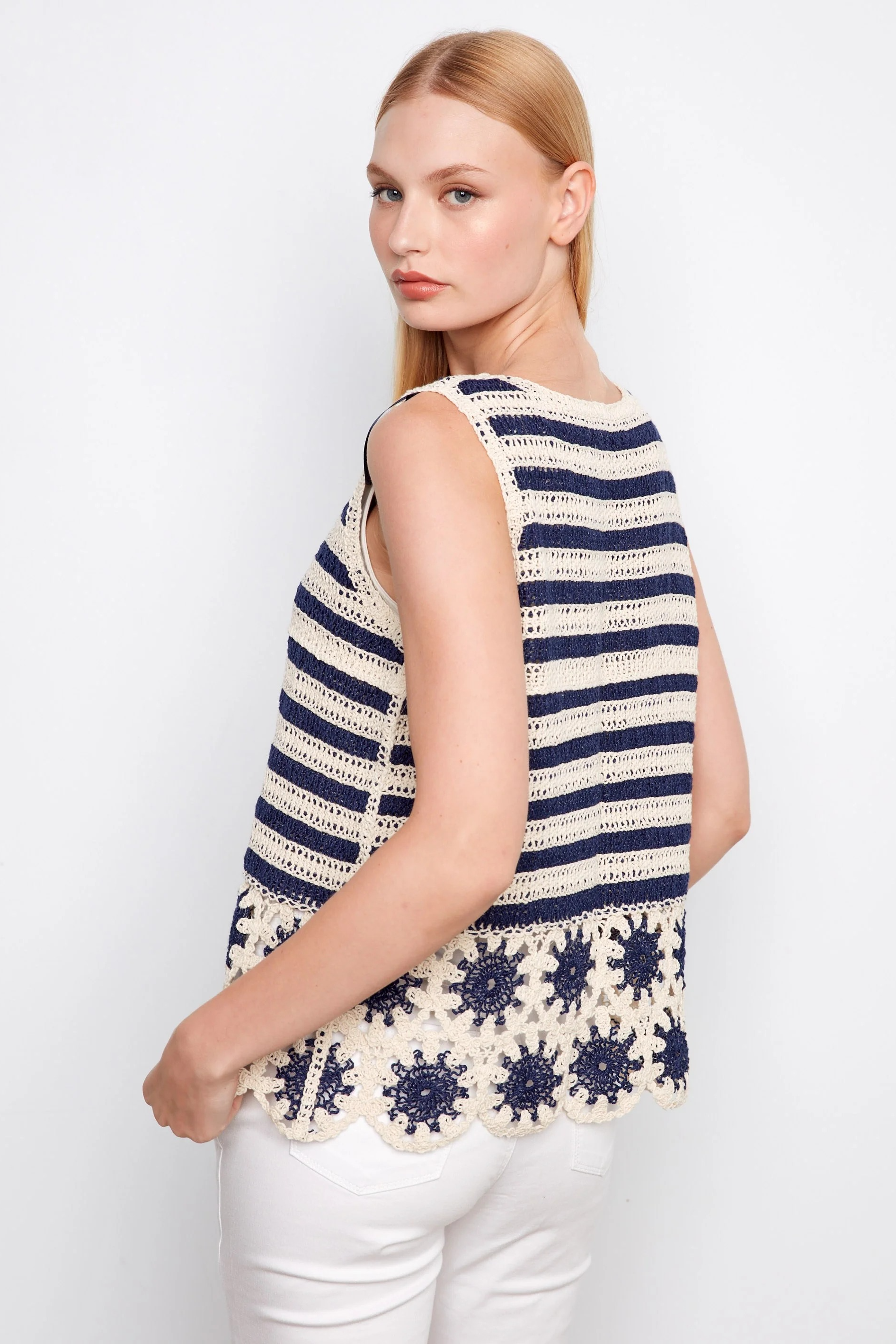 A breezy crochet tank with nautical-inspired navy and cream stripes and floral crochet hem. The Charlie B Crochet Top is sleeveless with a scoop neckline and a relaxed, slightly boxy silhouette perfect for warm days. Handcrafted crochet texture gives it a boho, artisanal feel that's ideal for casual outings or vacation packing. Charlie B adds a touch of seaside charm to an easy summer wardrobe.