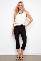 Breezy and textural, this Charlie B Sleeveless Crochet Blouse is a lightweight layering piece with open crochet motifs and a subtle V-neck. The sleeveless cut and slightly boxy silhouette make it ideal for warm-weather styling or easy vacation looks. Charlie B balances handcrafted crochet detail with a clean hemline for a polished yet relaxed finish. Pair it over a simple cami or wear it solo for an airy, casual vibe.