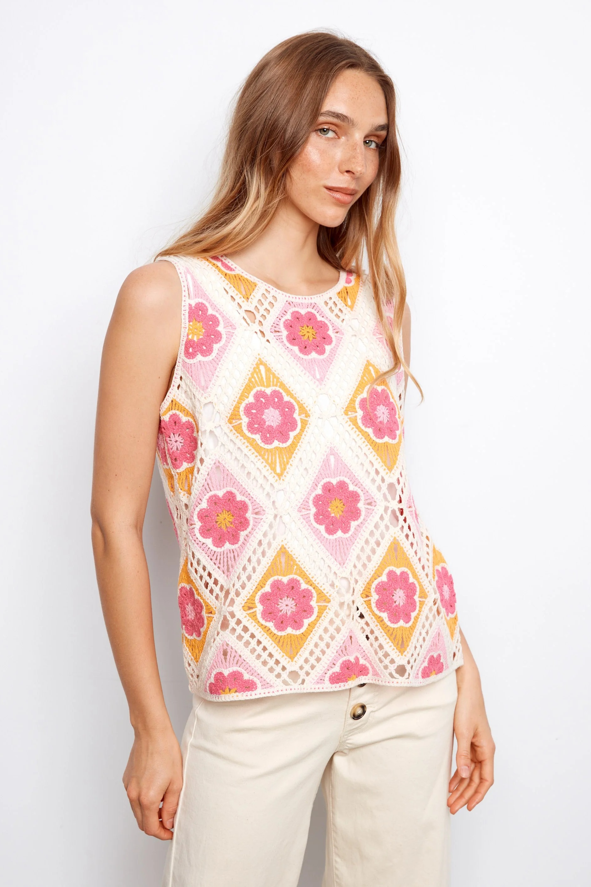 The Charlie B Sleeveless Crochet Top is a lightweight, sleeveless knit with openwork crochet and floral motif panels for a breezy, handcrafted look. It features a high crew neckline and a relaxed, slightly boxy silhouette that layers easily over tanks or bralettes. Charlie B brings a artisanal, vacation-ready vibe to this top with its textured stitchwork and warm pink and yellow accents. Wear it for casual weekends or packed into warm-weather getaways.