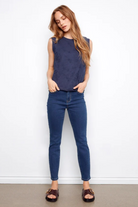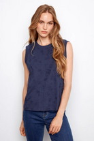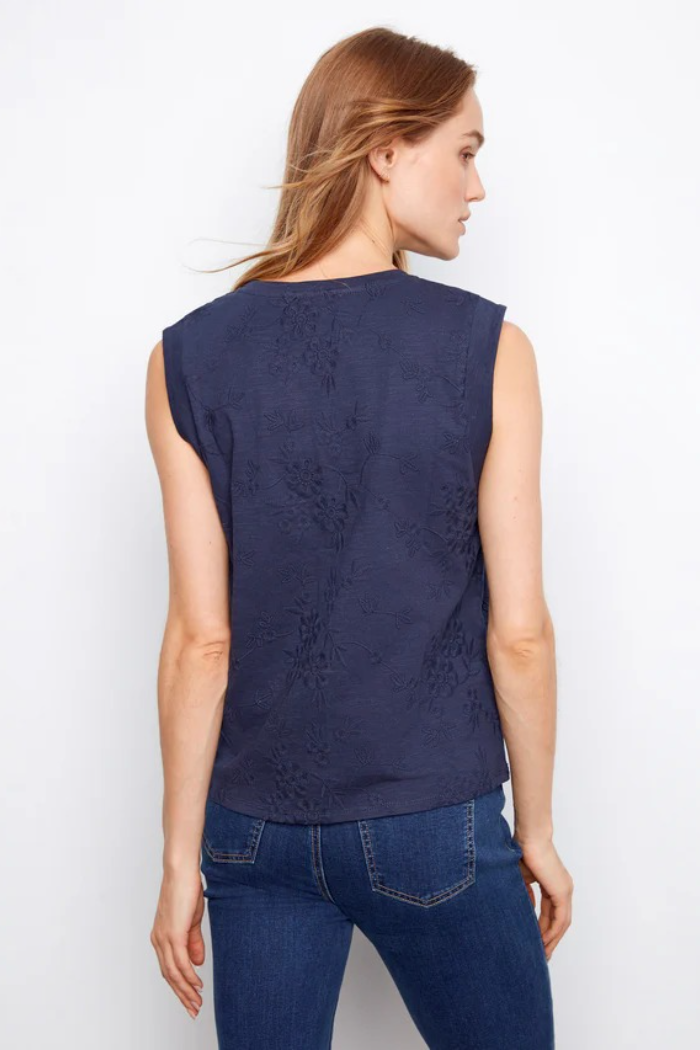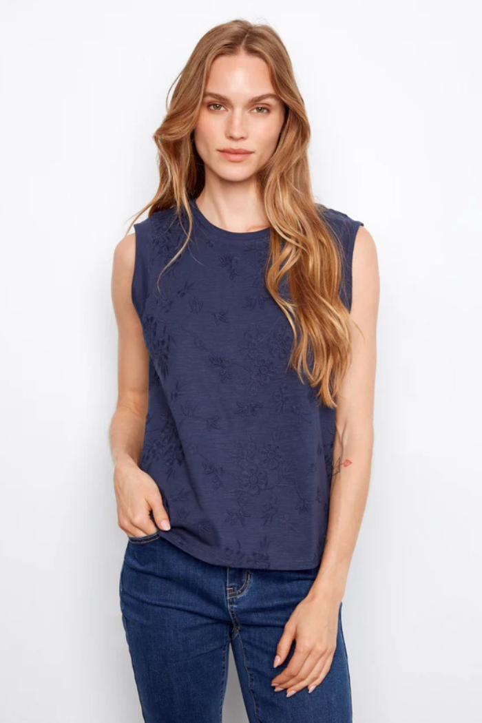 The Charlie B Tee is a sleeveless navy top with tonal floral embroidery and a relaxed, straight silhouette for easy layering. It’s made by Charlie B from a soft cotton-blend knit with subtle texture. Pair it with jeans for casual weekends or layer under a blazer for a polished everyday look.