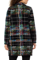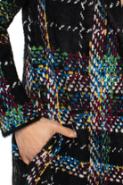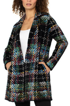 In a soft black multi-plaid, this open-front coatigan offers the perfect mix of structure and comfort. It features a double notch collar and clean seam pockets, draping effortlessly over knits, denim, or tailored layers. Ideal for cozy, polished days, it is a versatile piece you will reach for again and again.