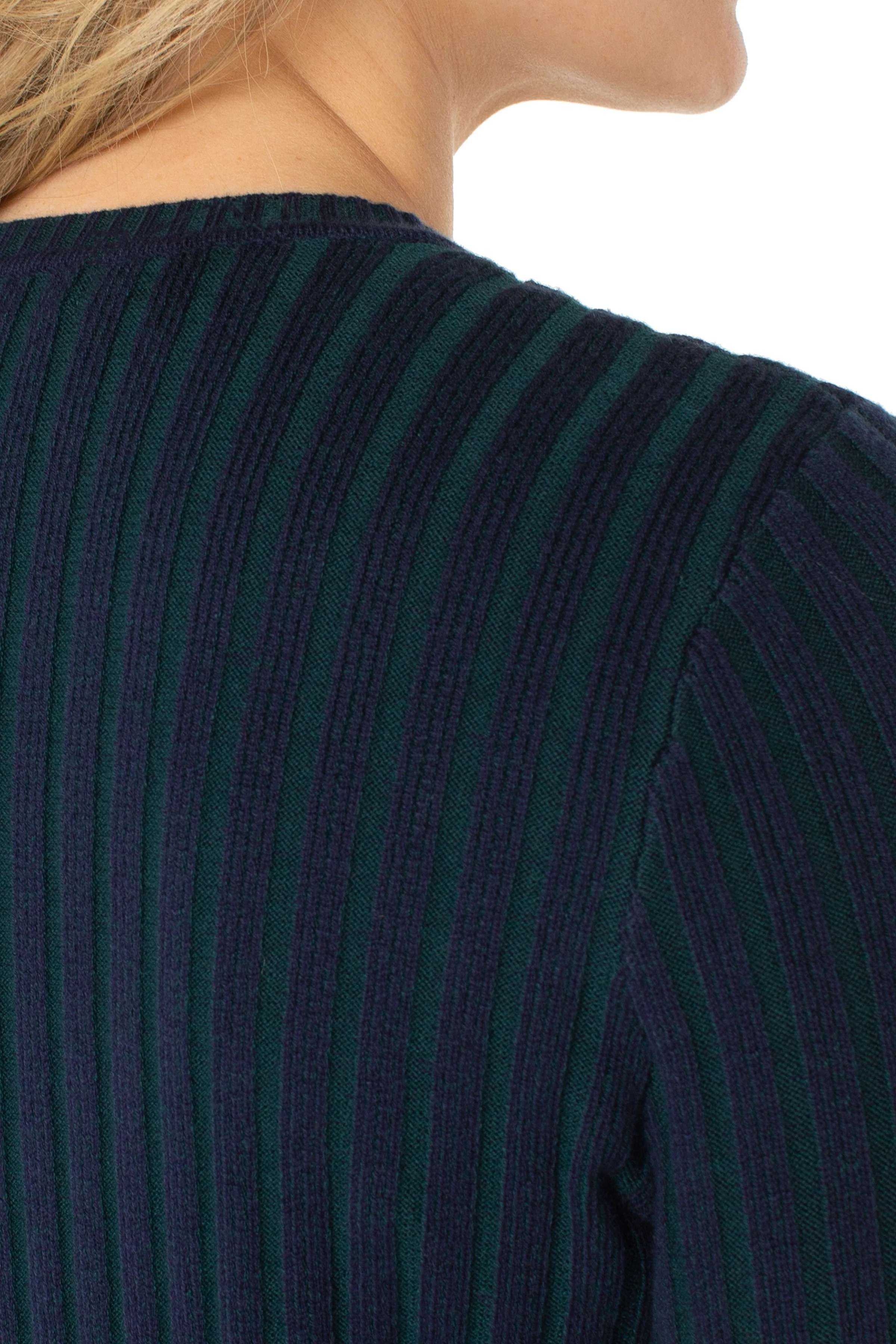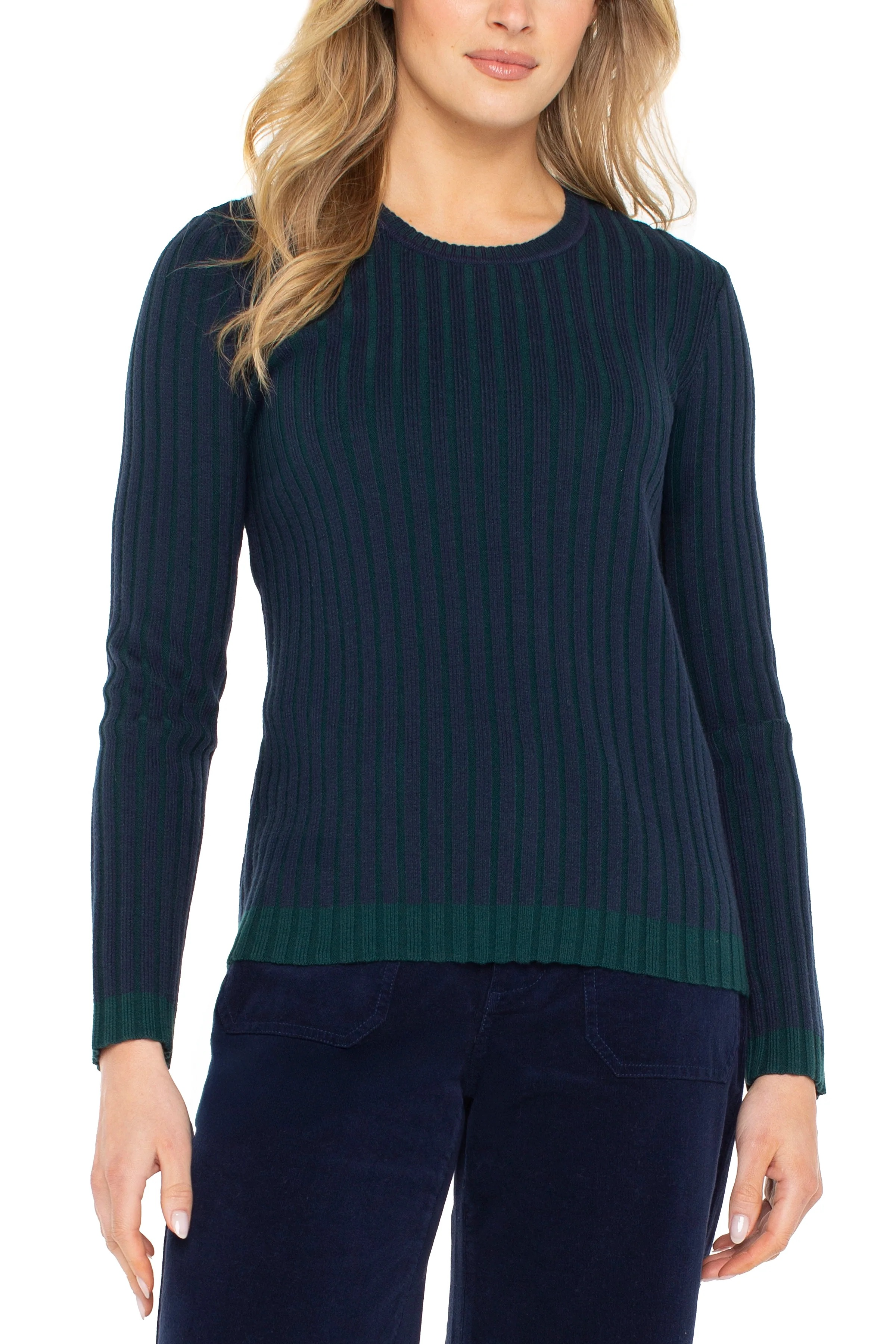 Classic knitwear meets modern style in this ribbed crew neck sweater. In a rich navy, it features emerald contrast accents for a subtle, refined twist on a timeless silhouette.