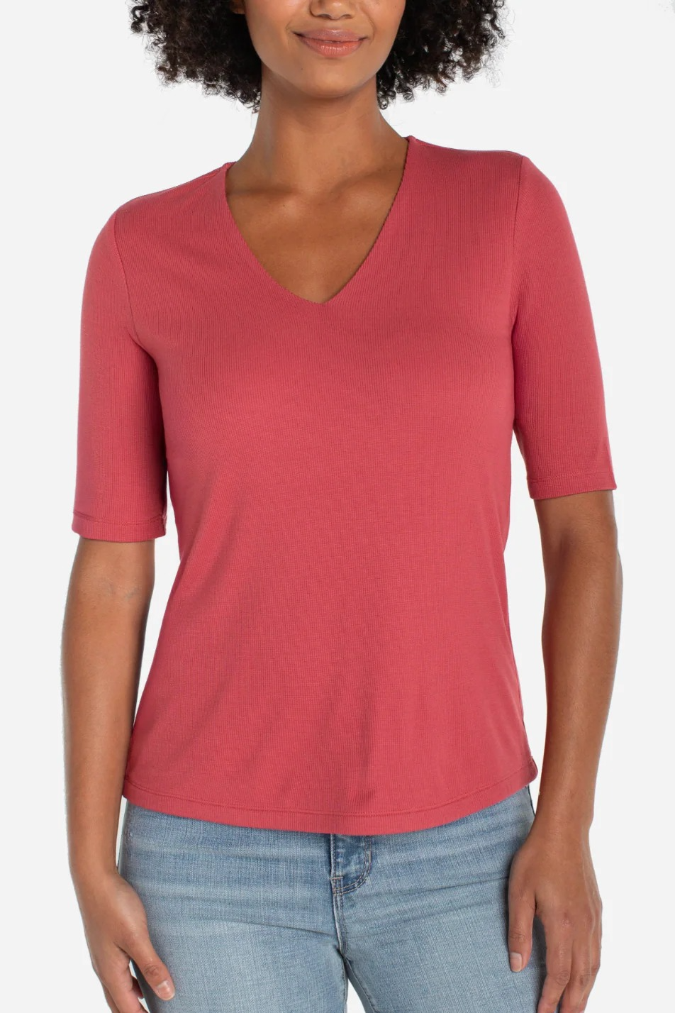 An elevated essential you will wear on repeat, this classic V neck top is crafted from a soft mini rib knit with just the right amount of stretch for a comfortable, flattering fit. The double layered front provides extra coverage and a smooth finish, giving you confidence without added bulk. The face framing neckline enhances the silhouette, making it perfect on its own or layered under jackets and cardigans. A true year round staple, it pairs effortlessly with denim, tailored trousers, or skirts for a polished everyday look.