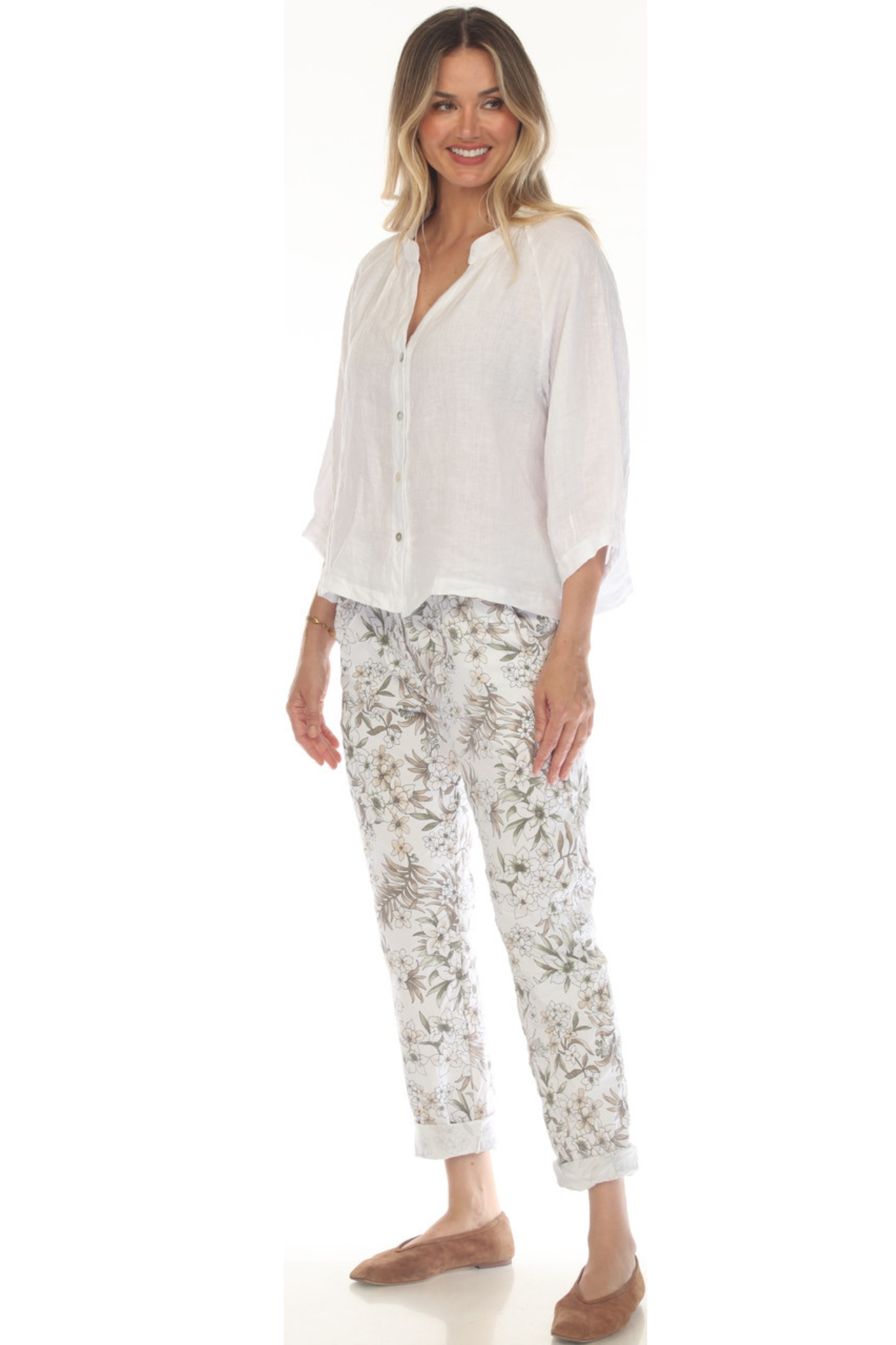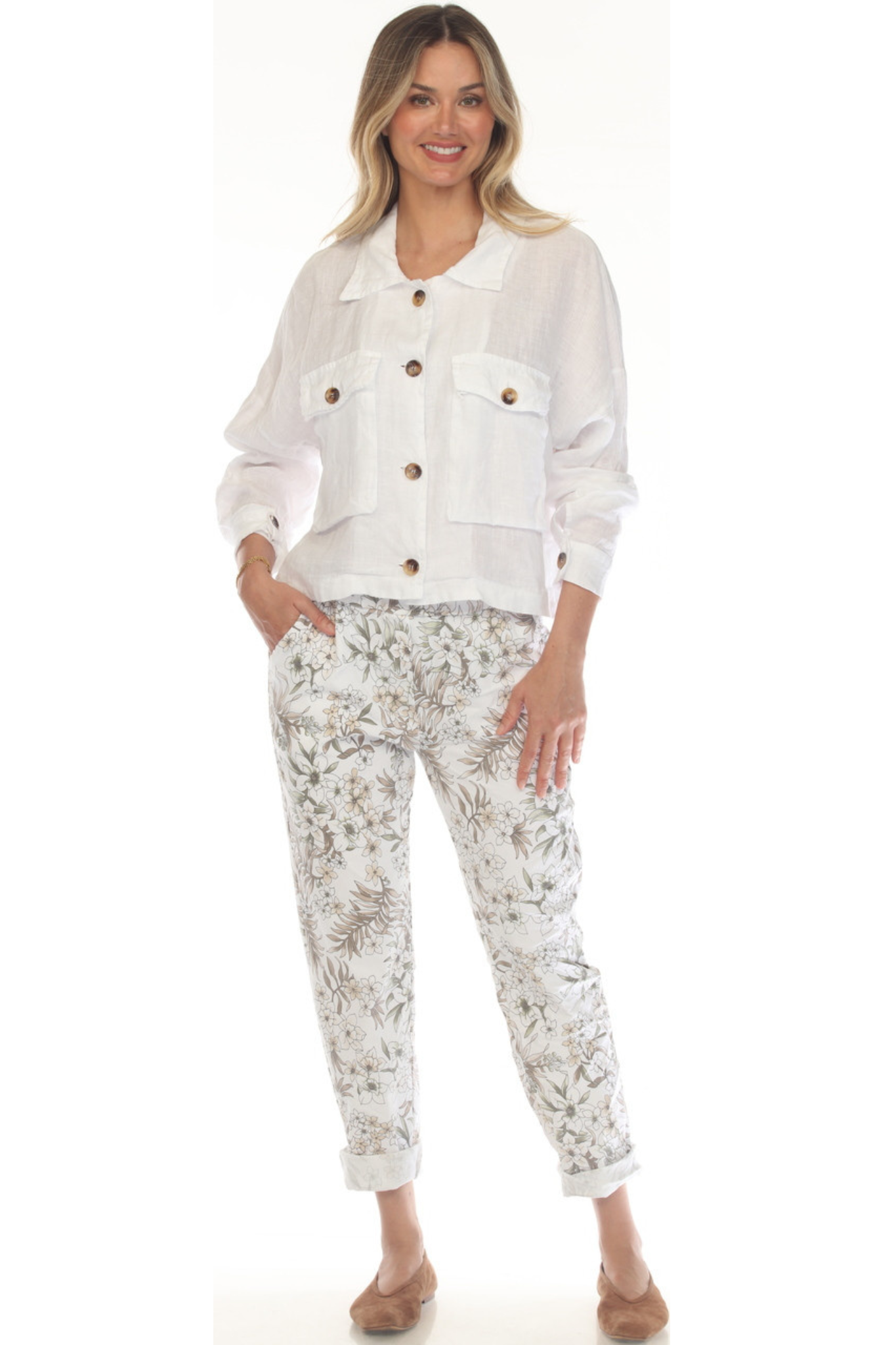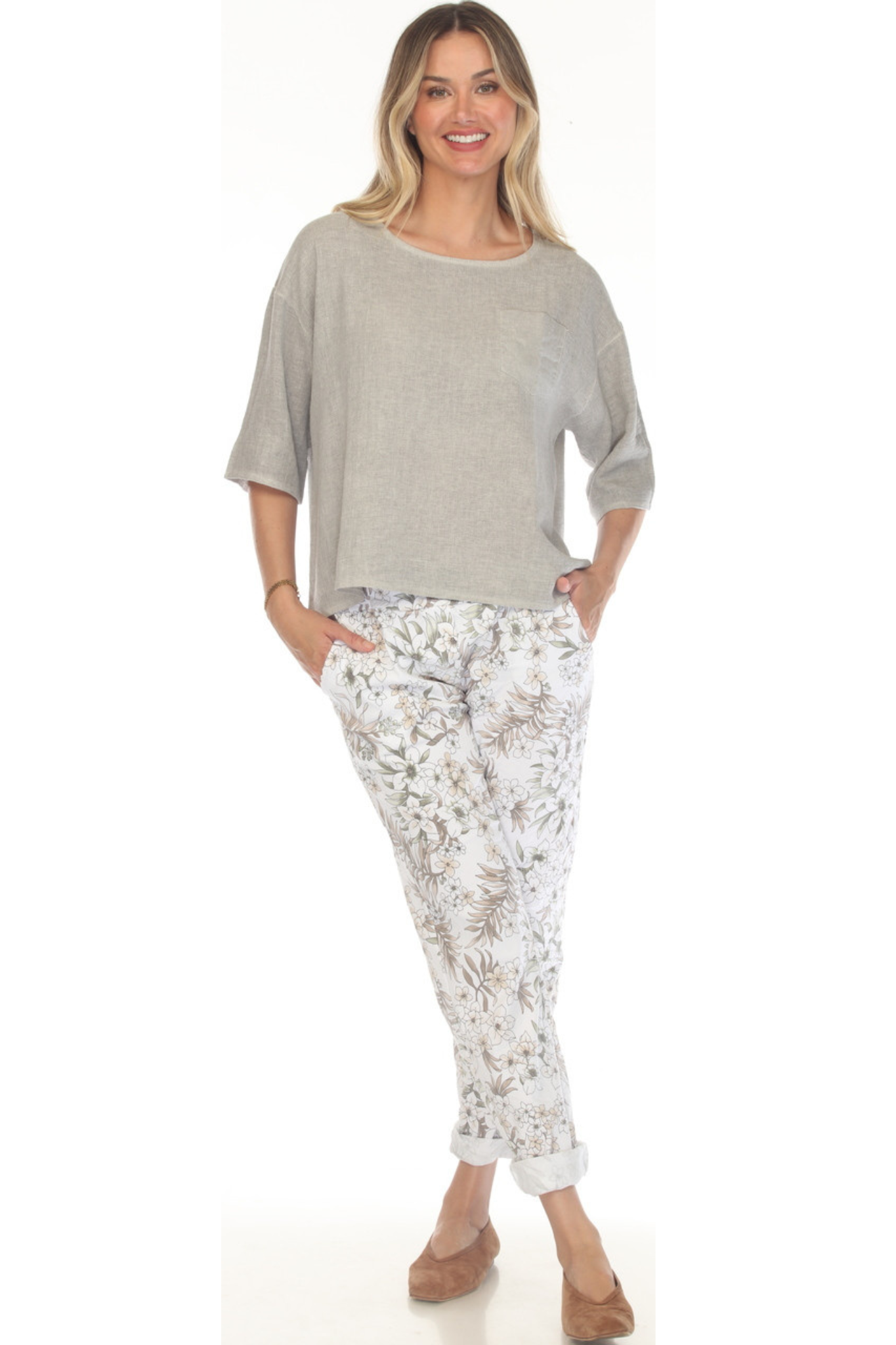 The Flora Ashley Pant is a lightweight, floral-printed trouser cut for a relaxed, everyday silhouette. These pants from Flora Ashley feature a slim tapered leg with a cropped/ankle length and subtle rolled hem for casual polish. Soft, breathable fabric and a mid-rise waist make them an easy choice for weekend wear or warm-weather outings.