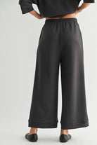 Stay effortlessly comfortable and stylish in these wide-leg black pants. Featuring a relaxed silhouette with an elastic drawstring waistband, they offer the perfect blend of ease and sophistication. The soft, drapey fabric moves with you, while the cuffed hem adds a refined touch. Ideal for lounging at home or pairing with a chic top for a minimalist everyday look.