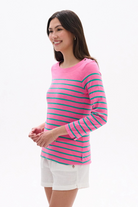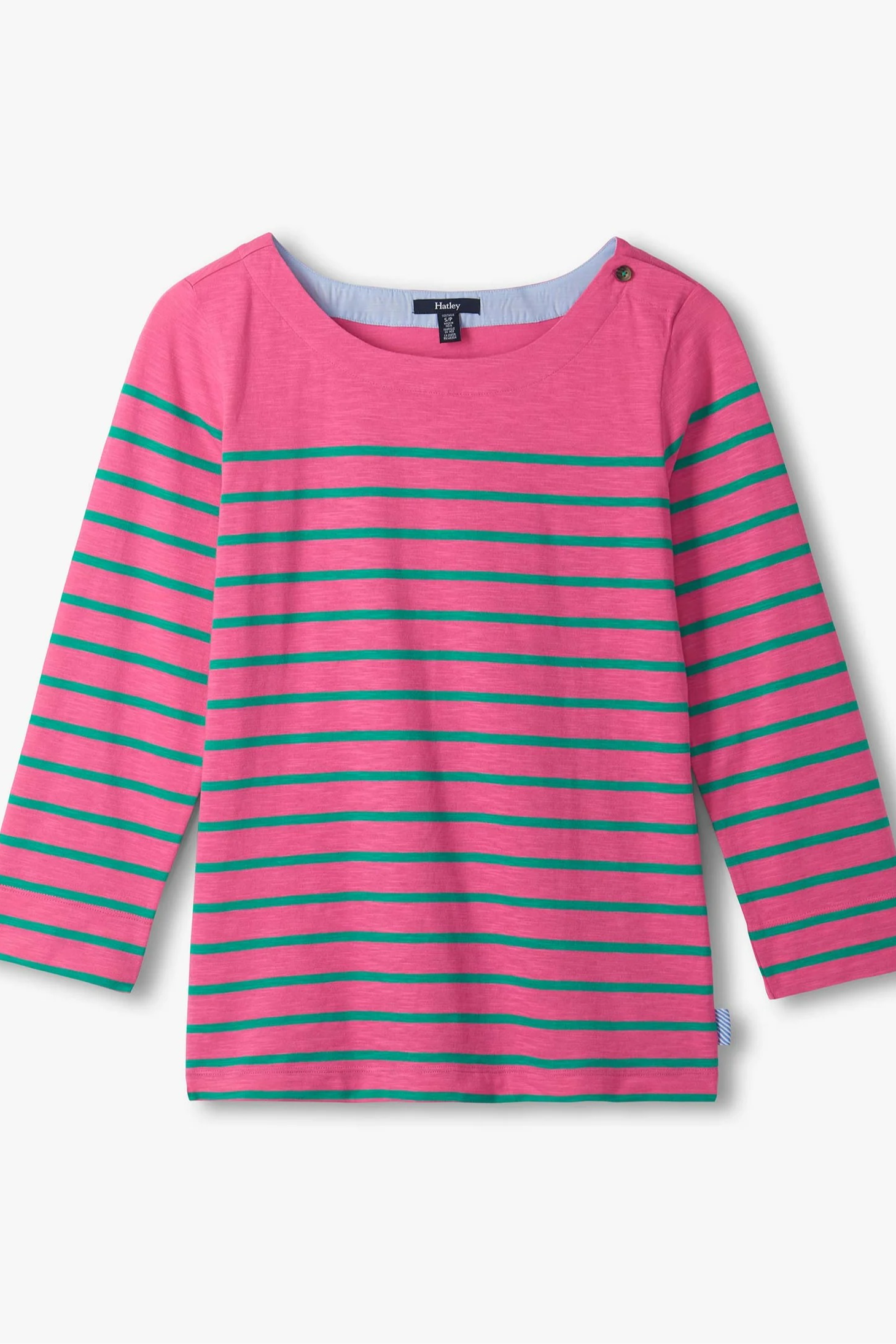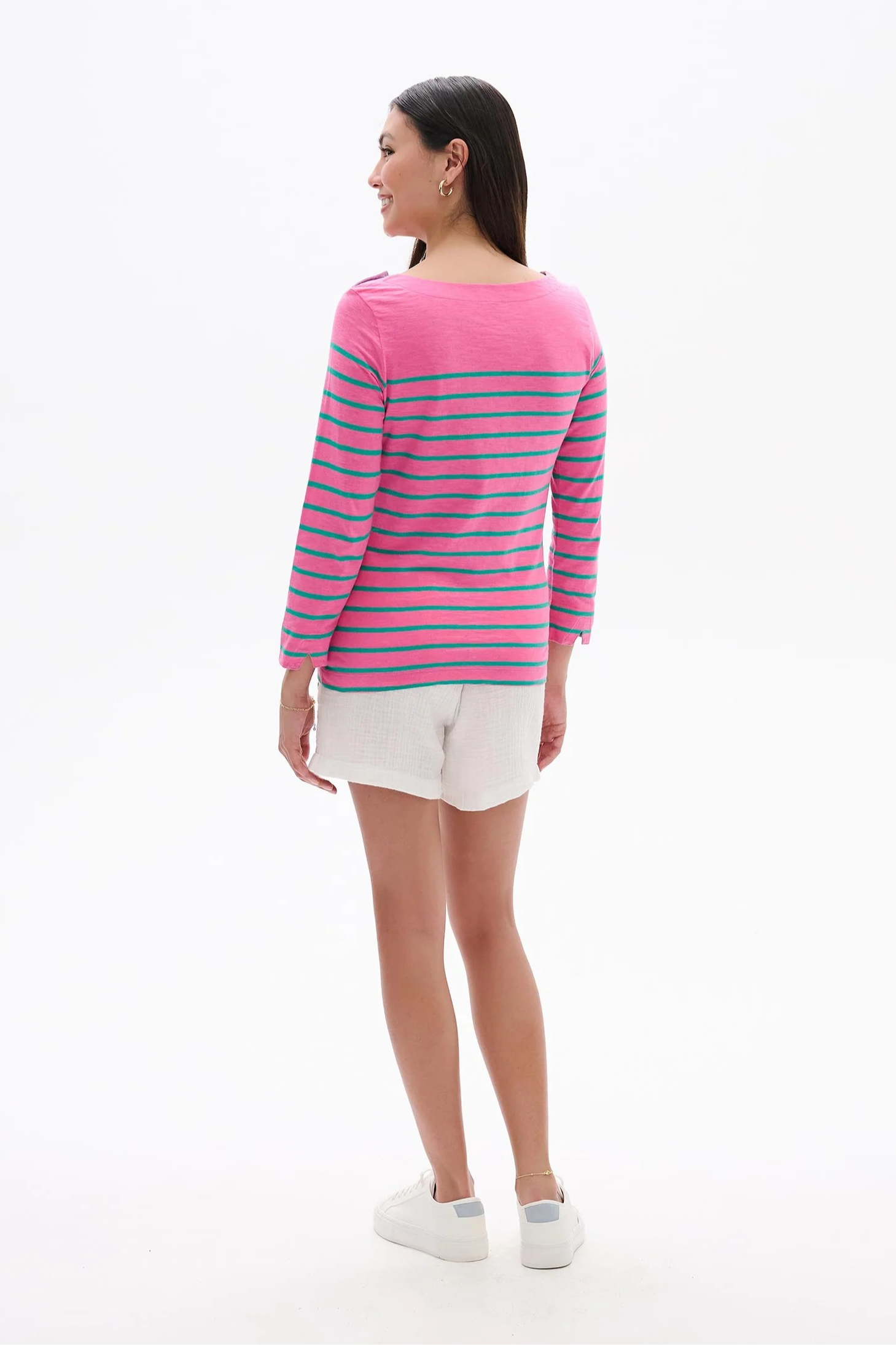 Lightweight and breathable, this Breton-inspired knit top blends a timeless silhouette with everyday comfort. Made from soft cotton, it features three-quarter sleeves, a wide neckline, and a single shoulder button for a subtle, stylish detail. Bold green stripes stand out against a heathered vibrant pink base, bringing a playful pop to this versatile layering piece.