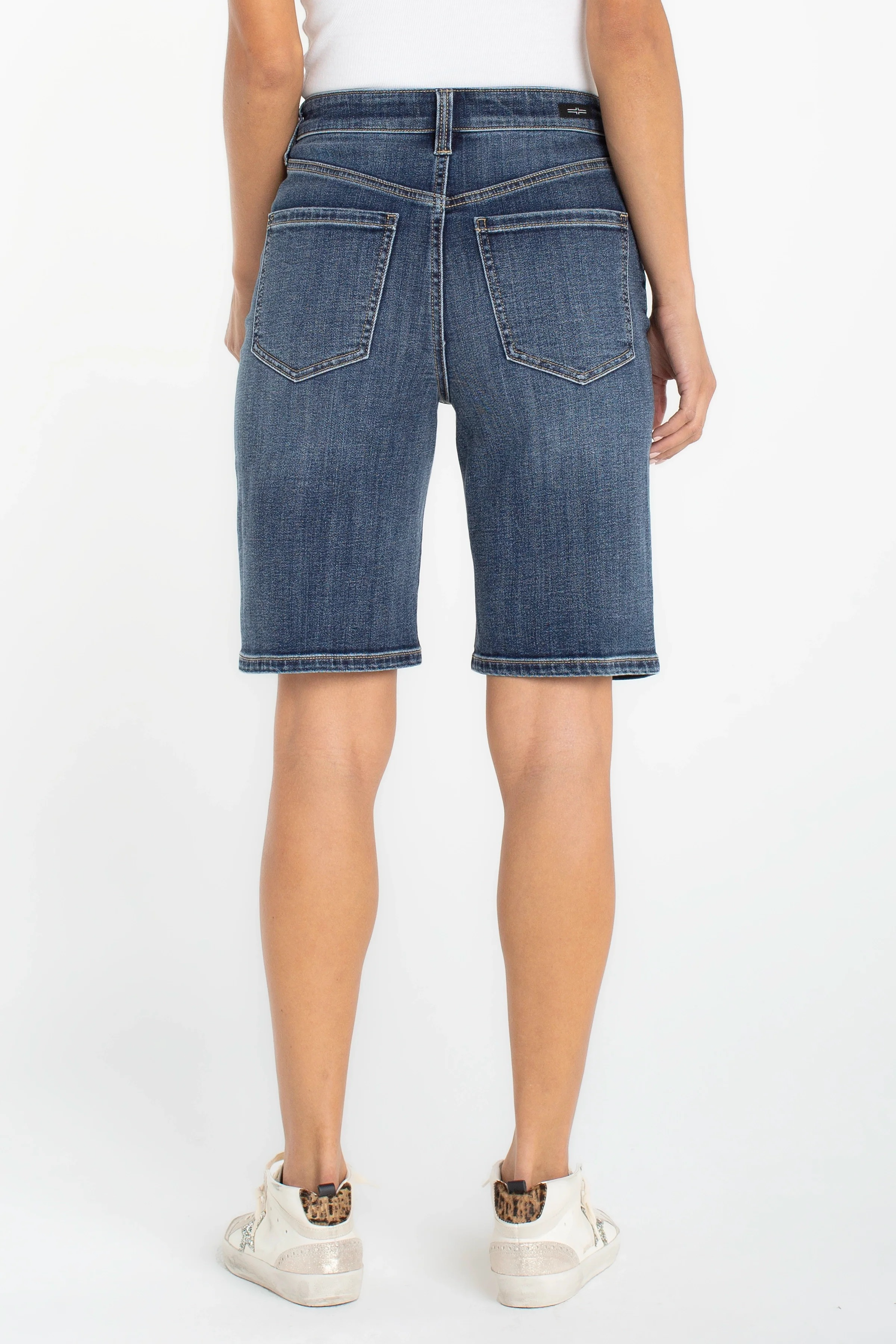 These High Rise Jort denim Bermudas hit at the knee for a laid-back, polished look. The Liverpool Shop High Rise Jort features classic five-pocket styling and light vintage wash on sturdy denim. The high-rise waist creates a flattering silhouette with a relaxed, slightly tailored leg. Perfect for casual weekends or running errands with sneakers or sandals.