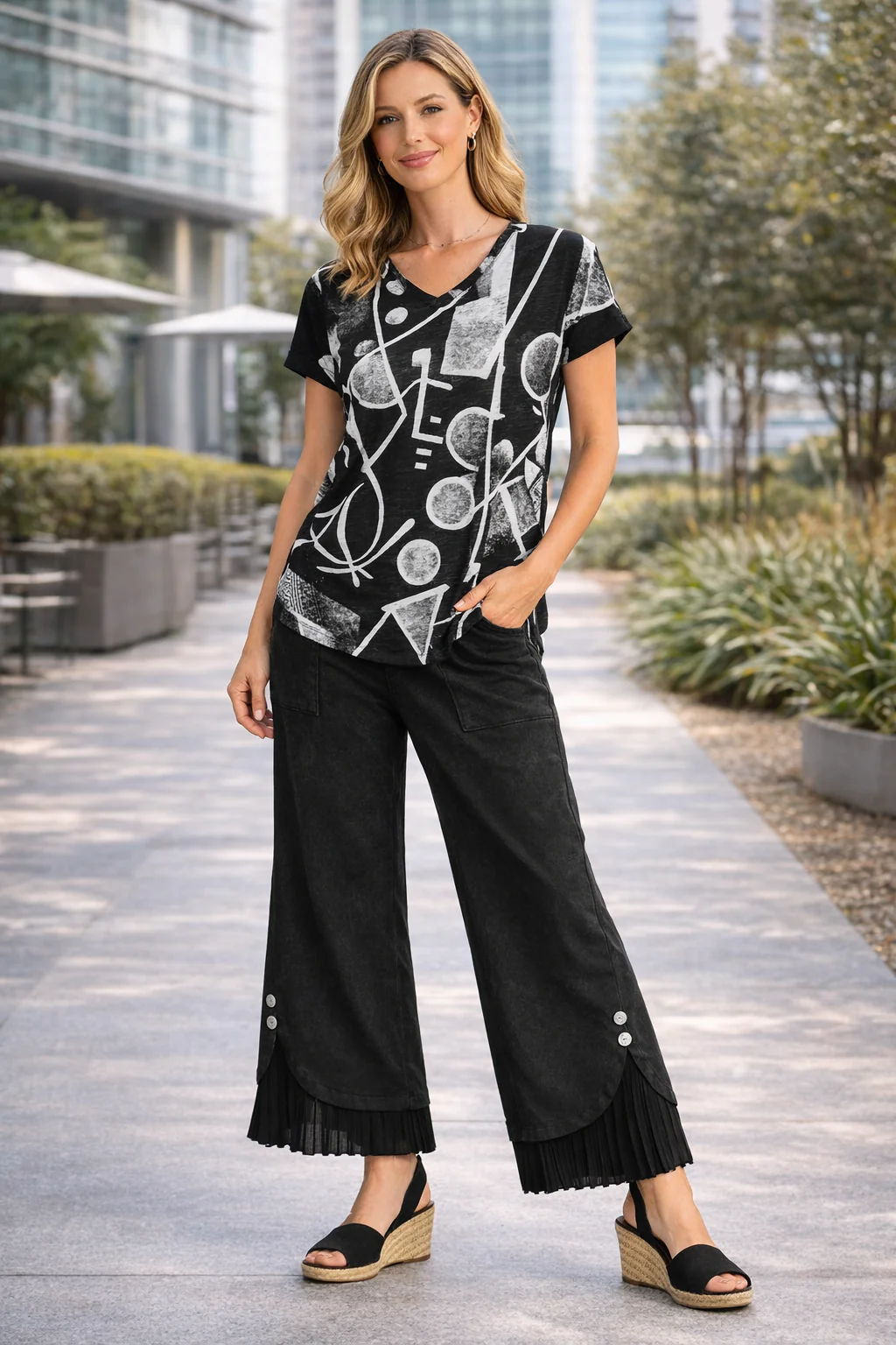 The modern abstract print brings a chic, contemporary feel, while the curved hemline adds a soft, feminine touch that complements both casual and more refined outfits. Made from a smooth stretch fabric, this top provides lightweight comfort that lasts all day.