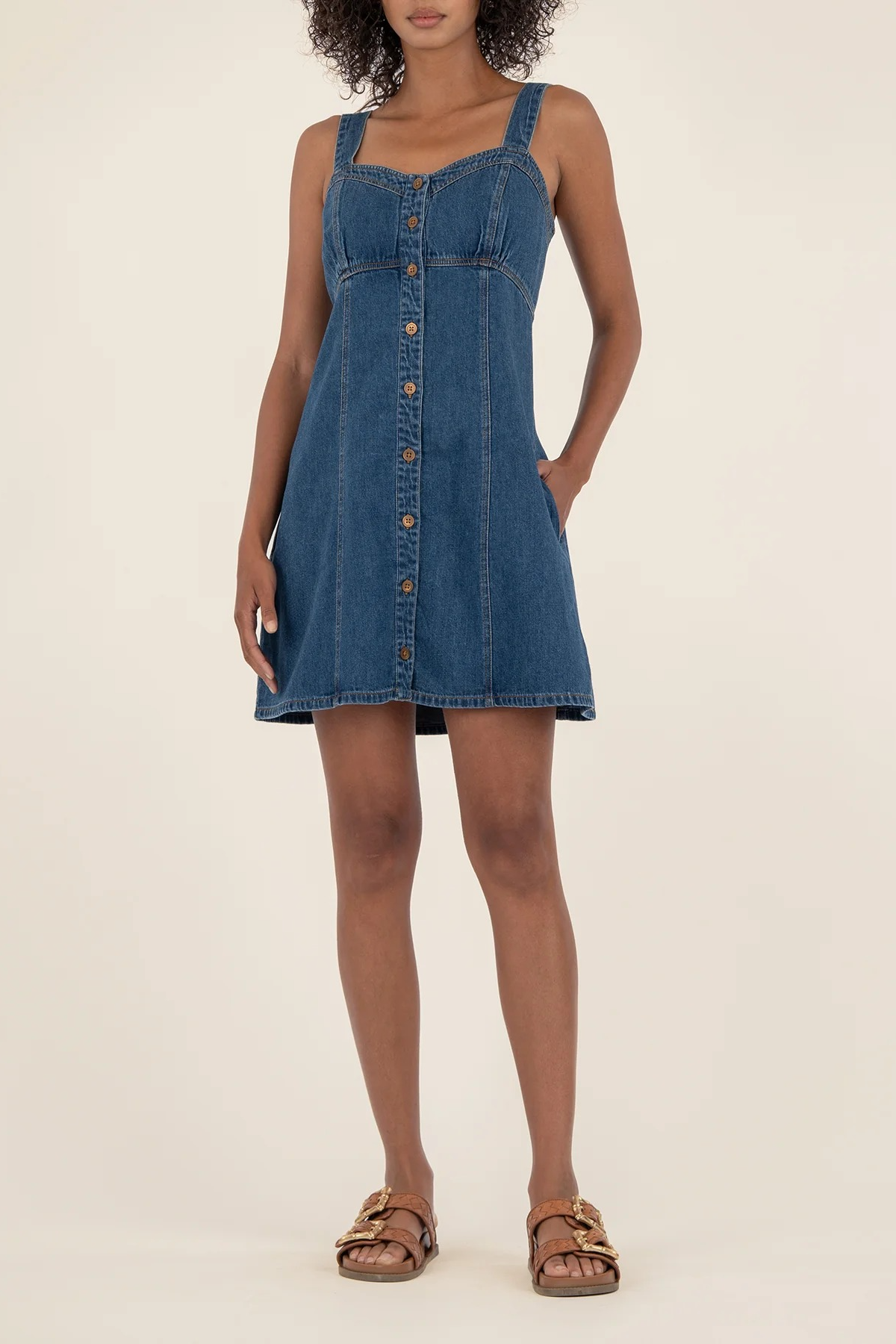 This adorable denim dress showcases a flattering A-line shape with a button-front design and a smocked back for all-day comfort and ease. Finished with adjustable straps, it’s the ideal mix of casual charm and everyday style.