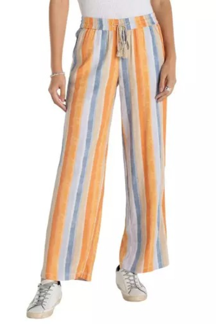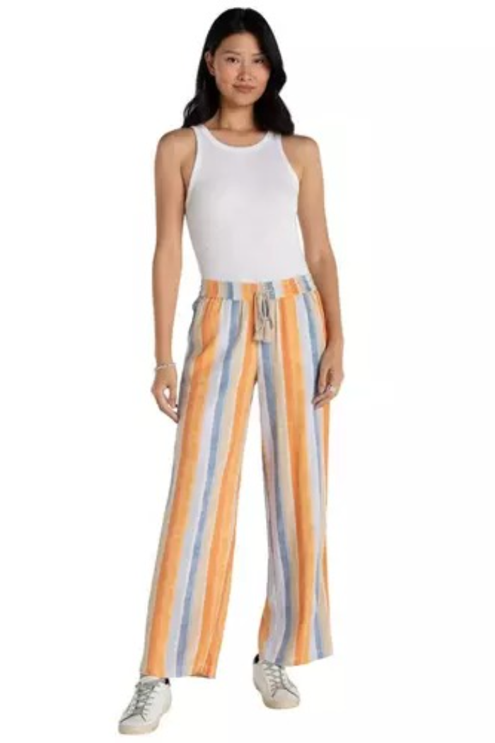 Effortless style meets comfort in these striped linen pants. Featuring a pull-on drawstring waistband and a flowing wide-leg silhouette, the playful multi-stripe print makes them perfect for sunny days and relaxed weekend outings.