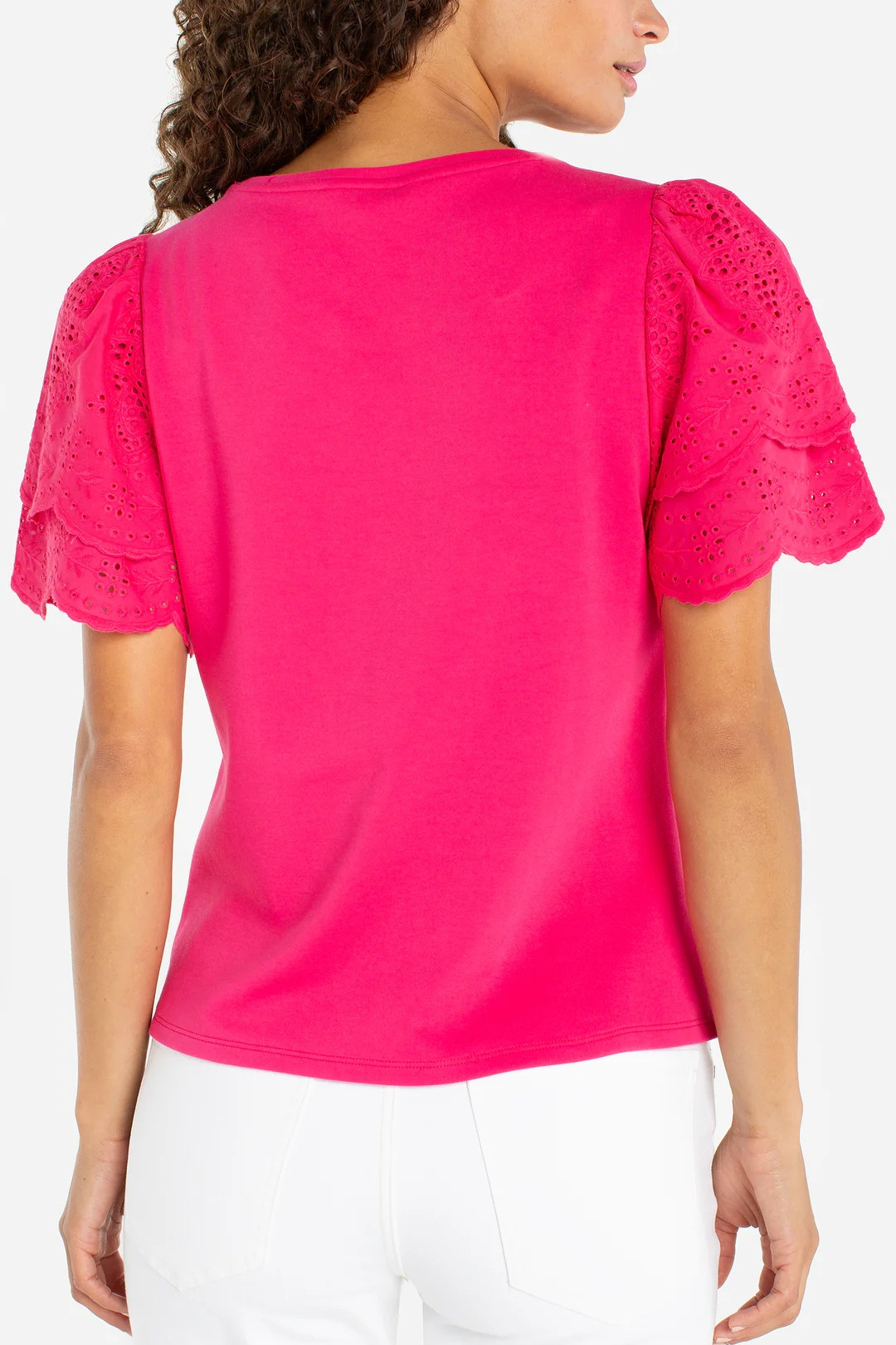 This diva pink knit-to-woven top stands out with ruffled sleeves accented by intricate embroidery. A clean crew neckline and short sleeves keep the look balanced, making it an effortlessly stylish and artful option for both day and night.