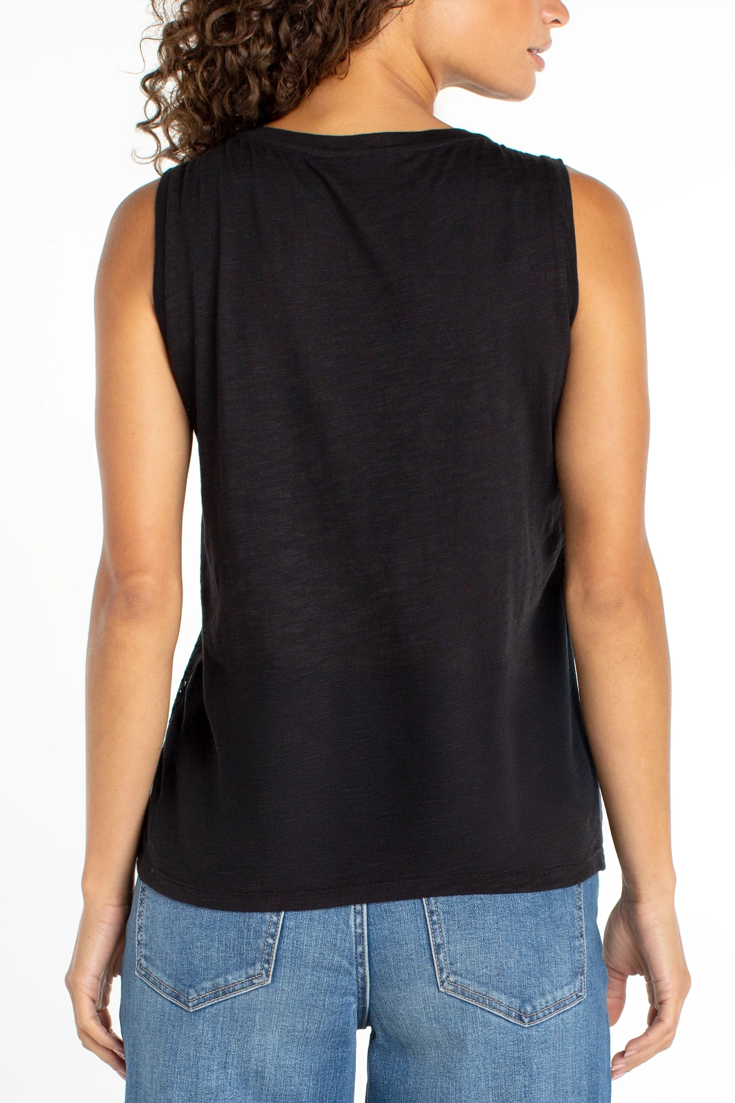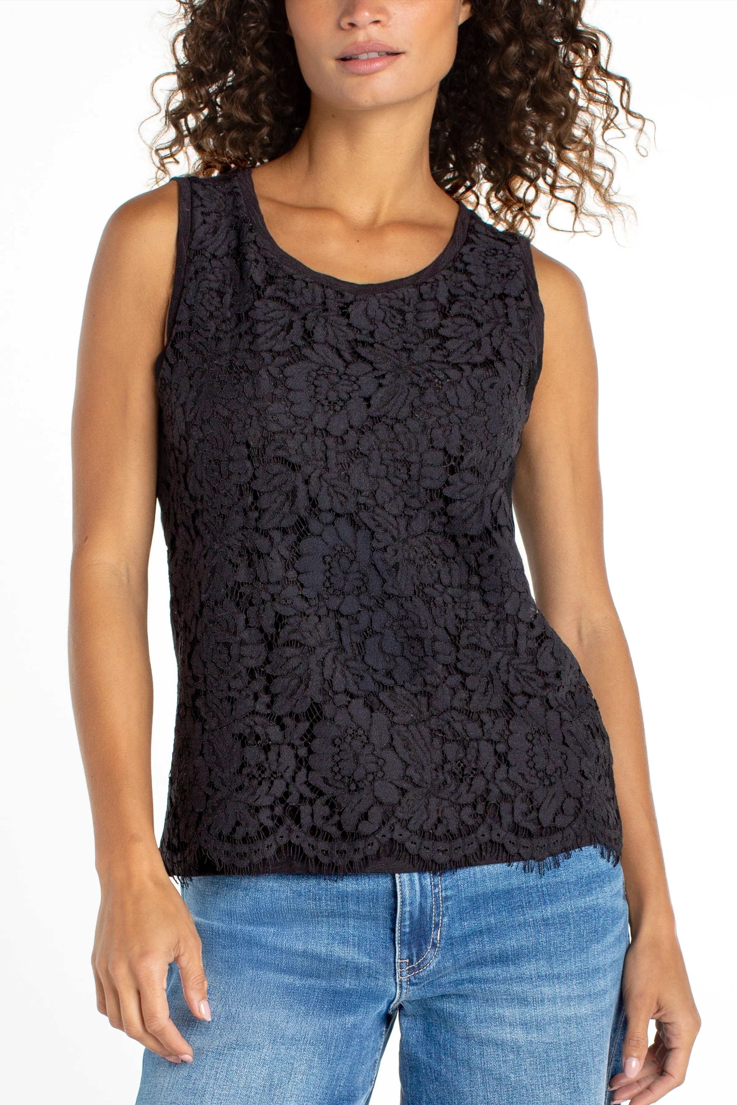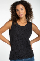 A modern blend of texture and sophistication, this sleeveless lace to knit hybrid top brings elevated detail to your everyday wardrobe. Designed in a rich black hue, it pairs delicate lace with soft knit fabric for a beautiful contrast that feels both feminine and wearable. The sleeveless silhouette makes it perfect for warm days or effortless layering under blazers and cardigans, while the consistent fit ensures comfort you can count on. Easy to dress up with tailored trousers or keep chic with denim or the matching pull on knit skort, this versatile piece transitions seamlessly from day to night with polished confidence.