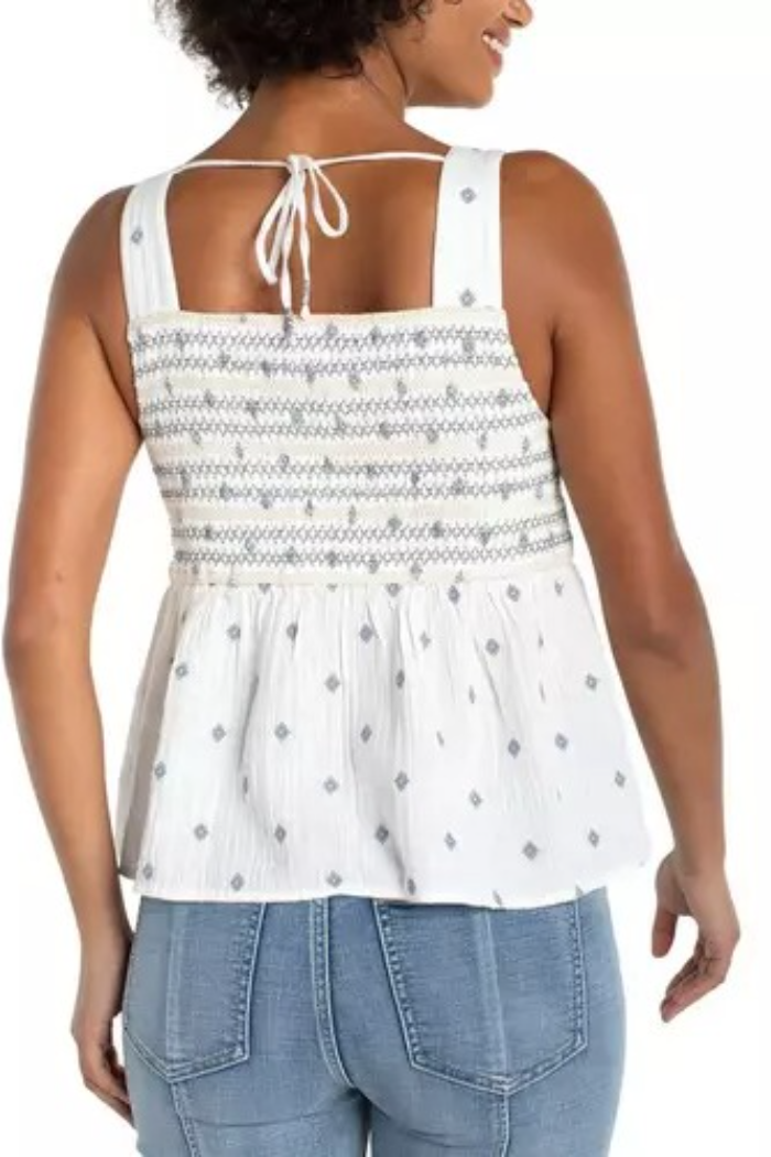 Light and airy, this Sleeveless Smocked Woven Top features a smocked bodice and a flared, woven peplum hem for easy summer style. The wide straps and square-like scoop neckline give it a relaxed, modern silhouette that pairs effortlessly with denim. Liverpool Shop crafted the top with breathable woven fabric and delicate printed detailing for a casual, vacation-ready vibe.