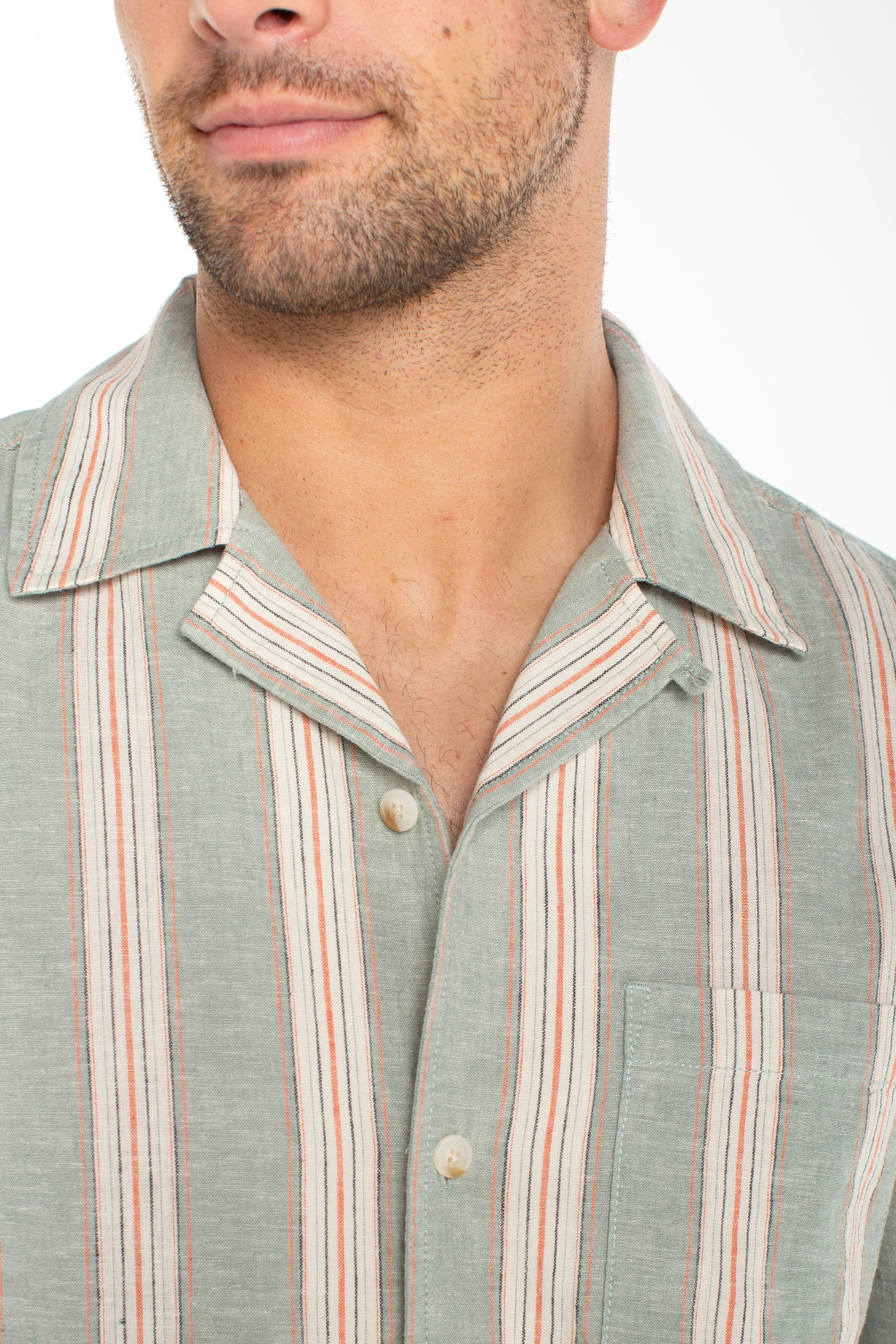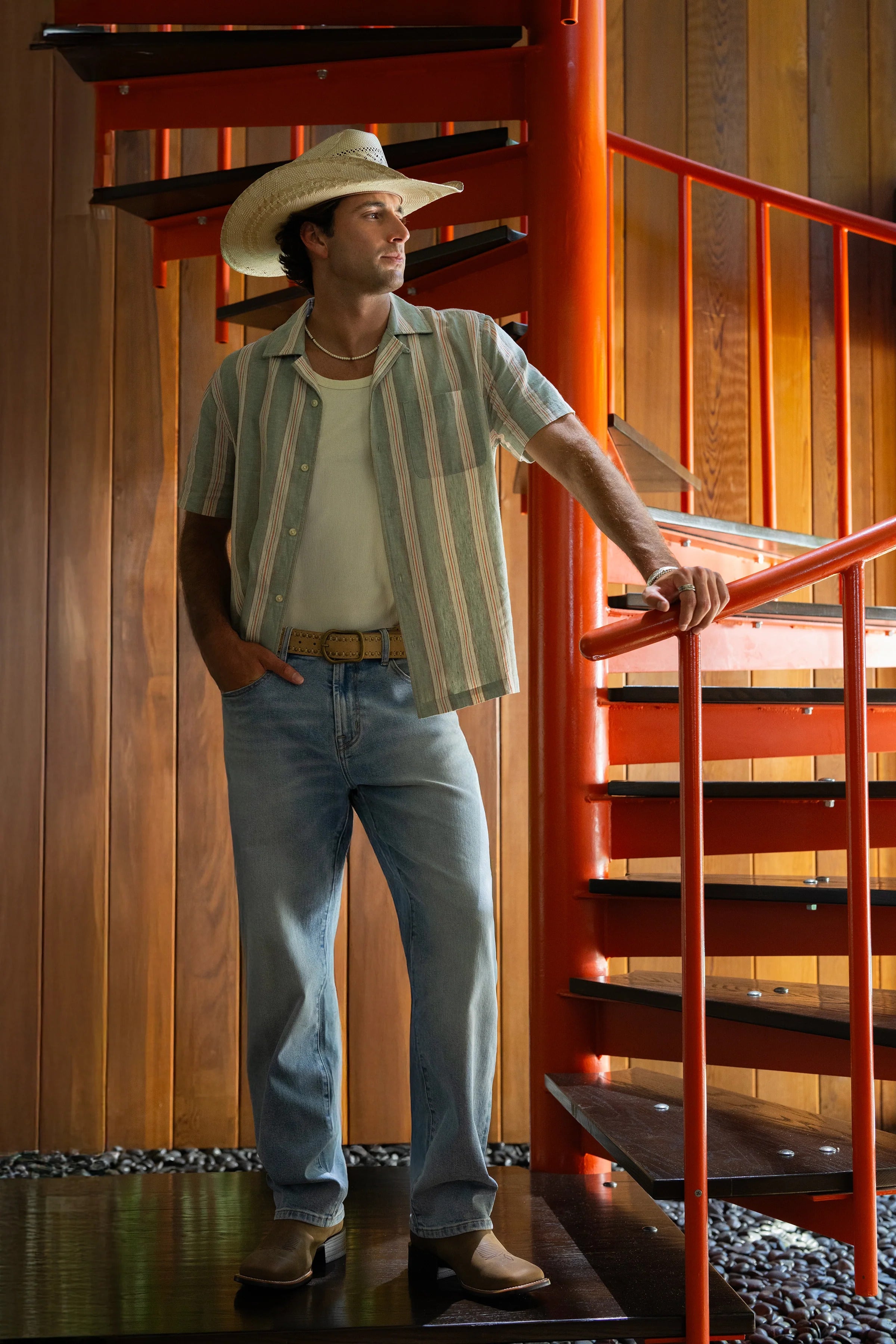 A relaxed short sleeve button-up shirt with an open camp collar and vertical stripes for a laid-back look. The Short Sleeve Button-Up Shirt has a lightweight, breathable weave and a slightly boxy silhouette that layers easily over tees. This style is offered by Liverpool Mens and pairs well with denim or chinos for warm-weather outings.