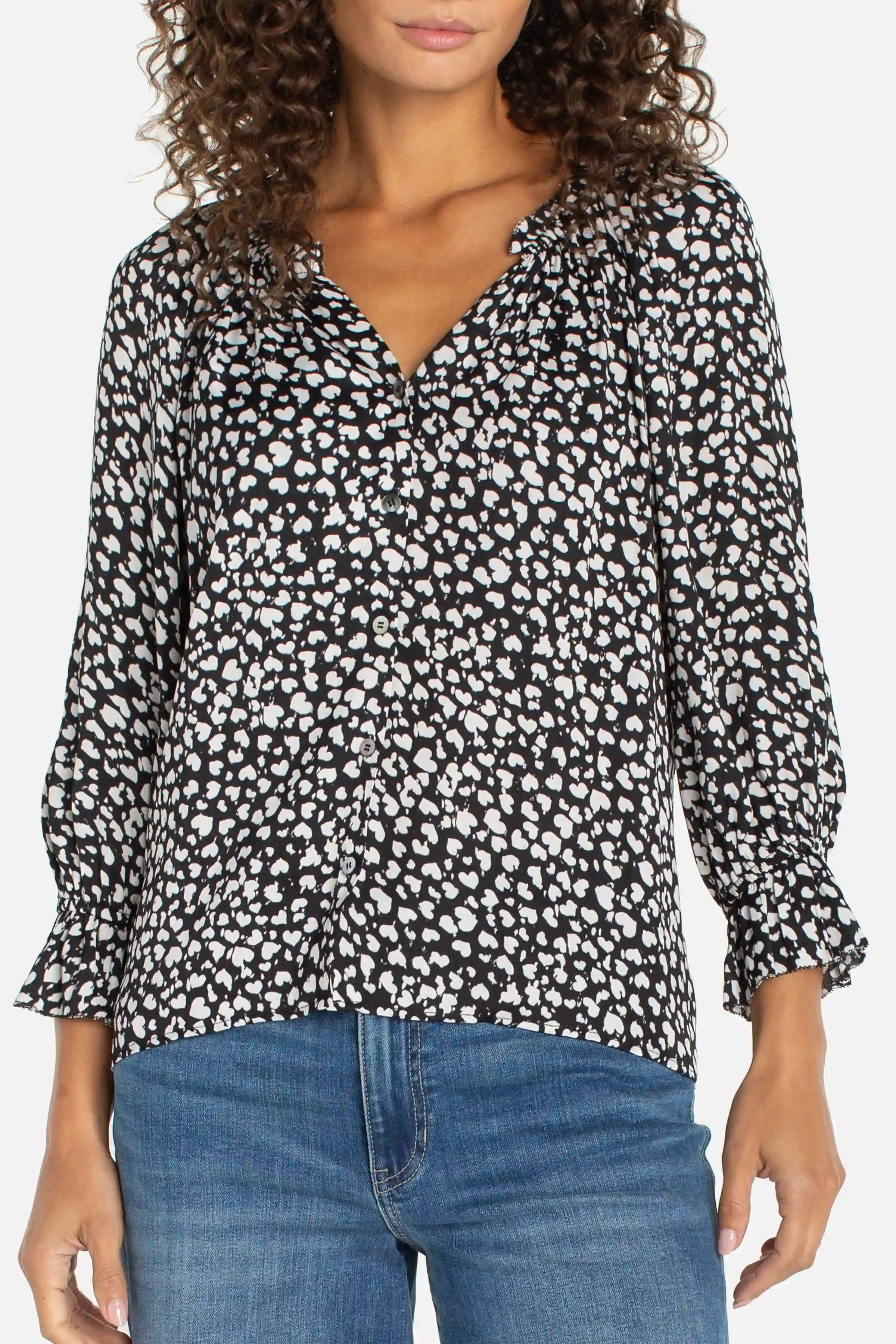 The Trunk Blouse is a relaxed button-front top in a black-and-white allover print with a soft V-neck and gathered shoulders. Liverpool Shop constructs it from a lightweight woven with long, slightly blouson sleeves and ruffled cuffs for subtle shape. Tuck it into denim for everyday casual wear or pair with tailored pants for a polished office look.