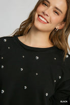 Add a touch of edge to your casual wardrobe with this French terry top featuring metallic studs for a subtle shimmer. Designed with a relaxed, boxy fit, round neckline, and raw hem detailing, it pairs effortlessly with denim or faux leather for a chic, laid-back look that stands out.