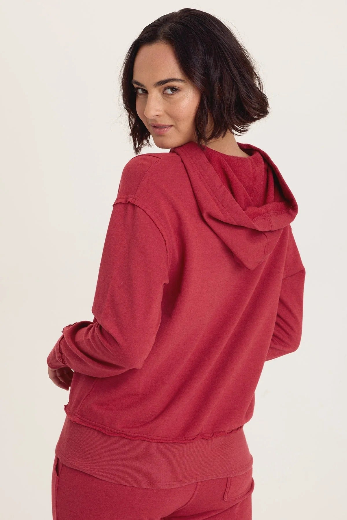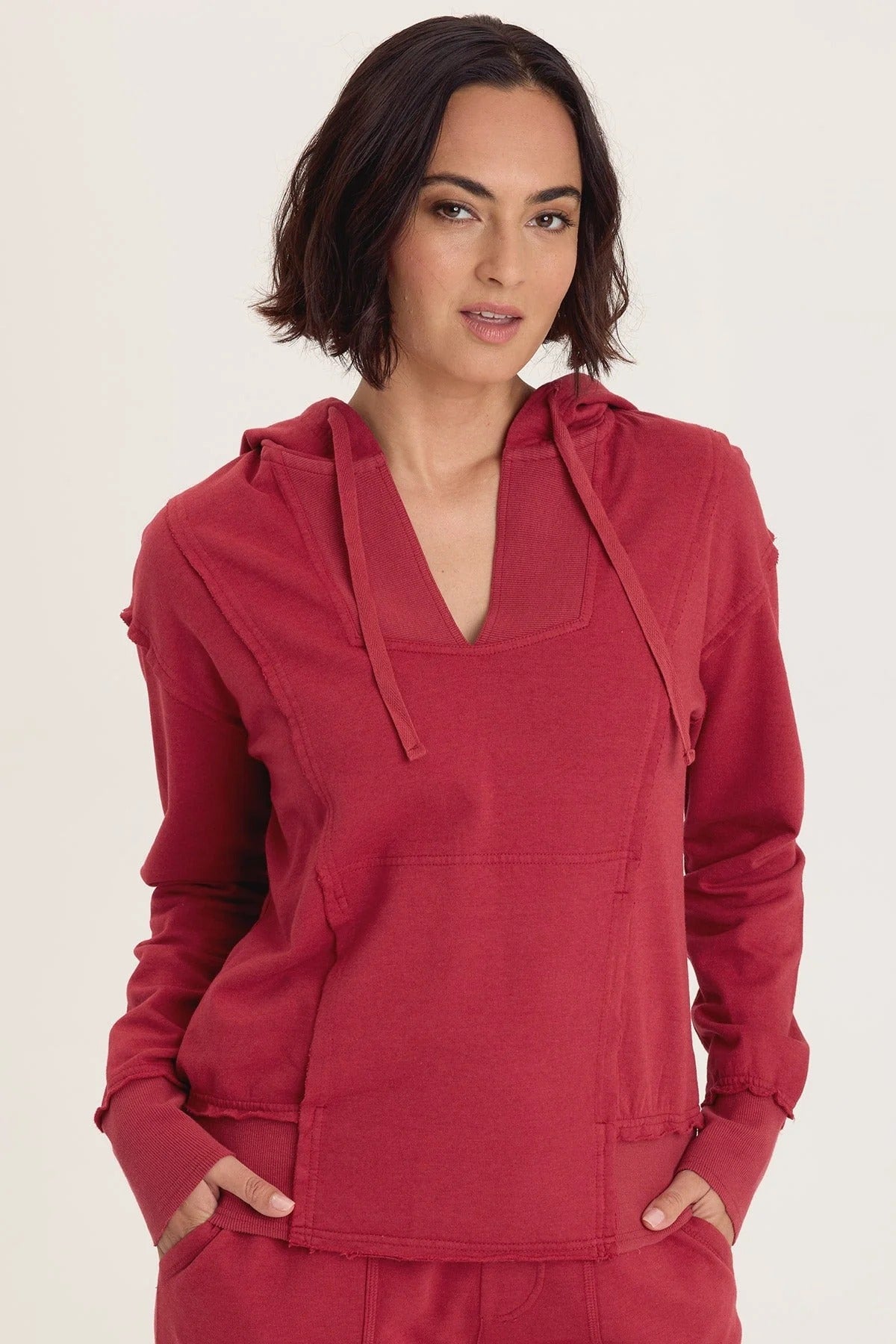 Raw-edge detailing and bold ribbed contrast make Rosalyn a true standout. Finished with a classic kangaroo pocket and flattering, slimming seams, this fashion-forward sweatshirt is destined to become a favorite.