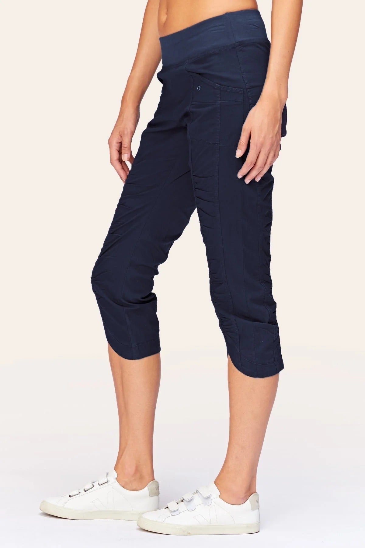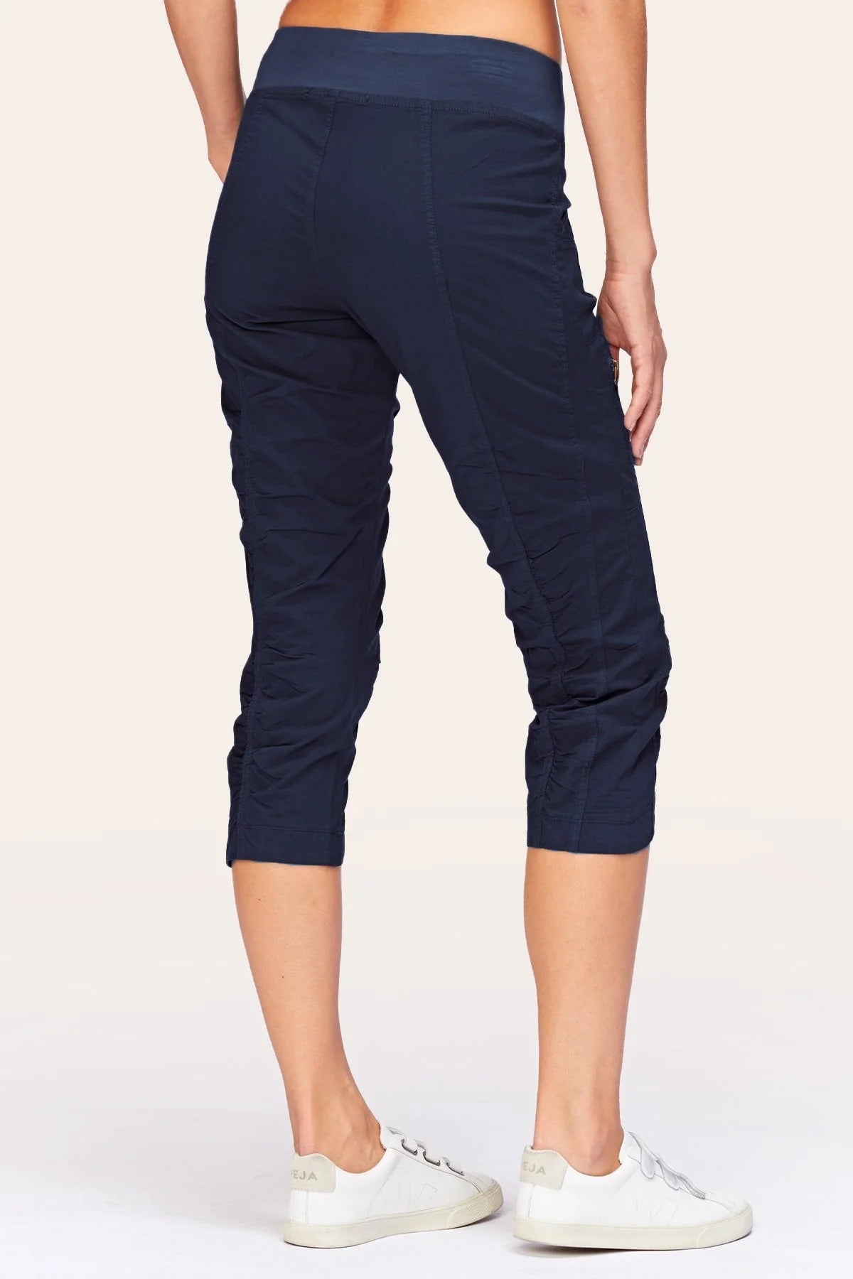 This poplin crop is designed with a flattering fitted silhouette, featuring two front pockets and a functional zip side pocket for a touch of edge. Ruching along the pant leg adds shape and dimension, while the scalloped hemline gives it a soft, feminine finish. Easy to dress up or down, it pairs effortlessly with fitted tops or relaxed knits for a polished yet playful look.