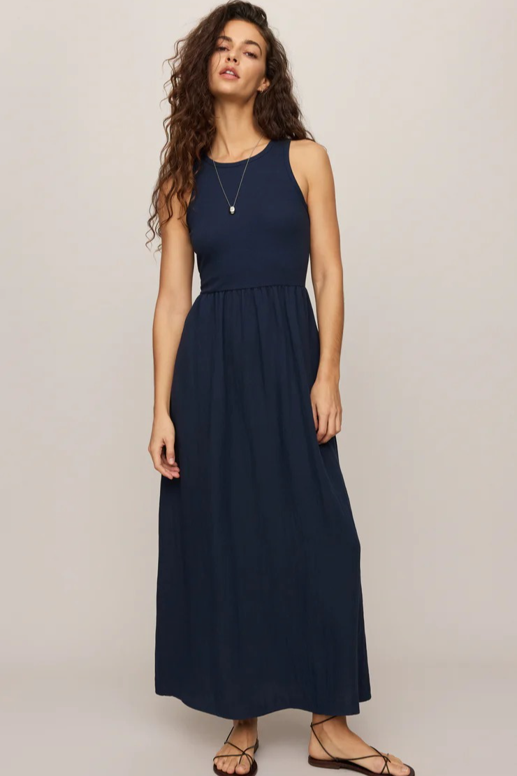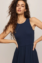 The soft ribbed bodice creates a flattering, fitted shape, while the textured rayon skirt drapes fluidly to an above-the-ankle length. Designed with a high neckline, sleeveless silhouette, and hidden pockets, this is an elevated everyday dress made for year-round wear.