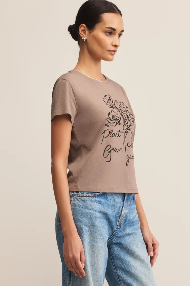 This short sleeve crew neck tee showcases a charming “Plant Seeds, Grow Gardens” floral graphic for a playful, mindful vibe. Crafted from soft-hand cotton jersey with an enzyme wash, it offers a relaxed fit that’s effortlessly comfortable and perfect for everyday adventures.