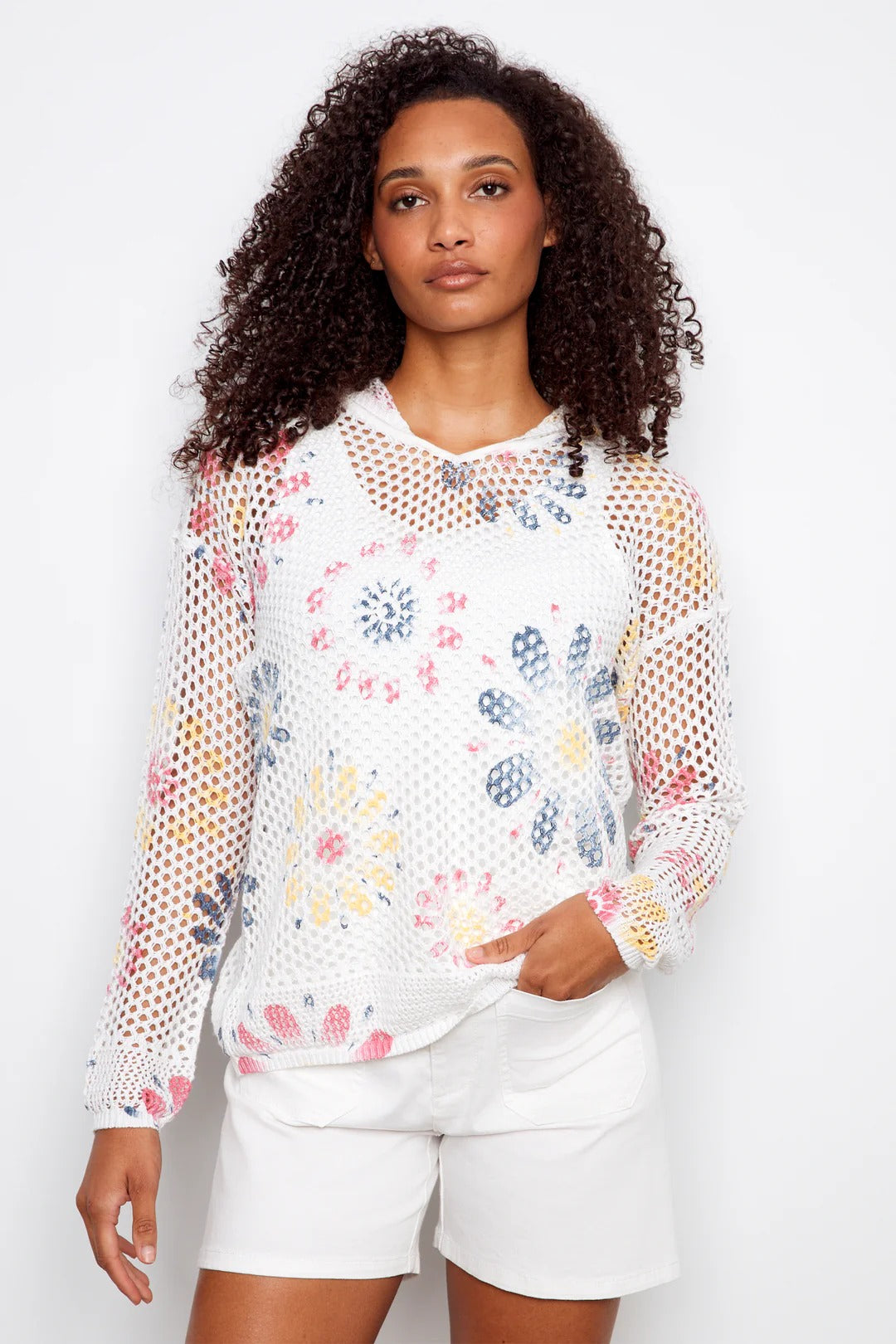 Add a playful touch to your wardrobe with this crochet hoodie. Made from a lightweight cotton blend, it features an eye-catching fishnet design accented with colorful spring daisy details. Soft and cozy with a fresh, fun feel, it is perfect for brightening up casual days and laid-back weekends.