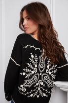 Step into effortless sophistication with this black ribbed sweater featuring a chic notch neckline and elegant white embroidery on the back. The drop-shoulder design and ribbed texture create a relaxed, contemporary silhouette that’s both flattering and comfortable. Perfect for casual days or dressed-up evenings, this sweater brings a refined yet modern touch to your fall wardrobe.