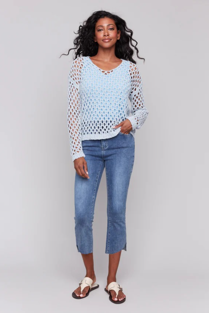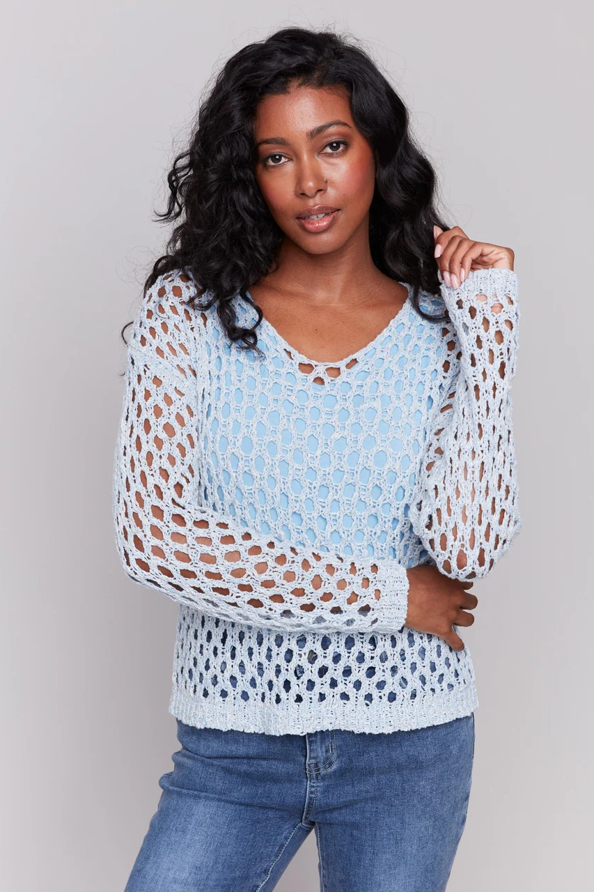 Elevate your look with our Denim Blue Braided Fishnet V-Neck Sweater. Designed with a unique textured fishnet pattern, this lightweight layer is perfect for spring and summer styling. The flattering V-neckline enhances its versatility, making it an essential piece for effortless chic.