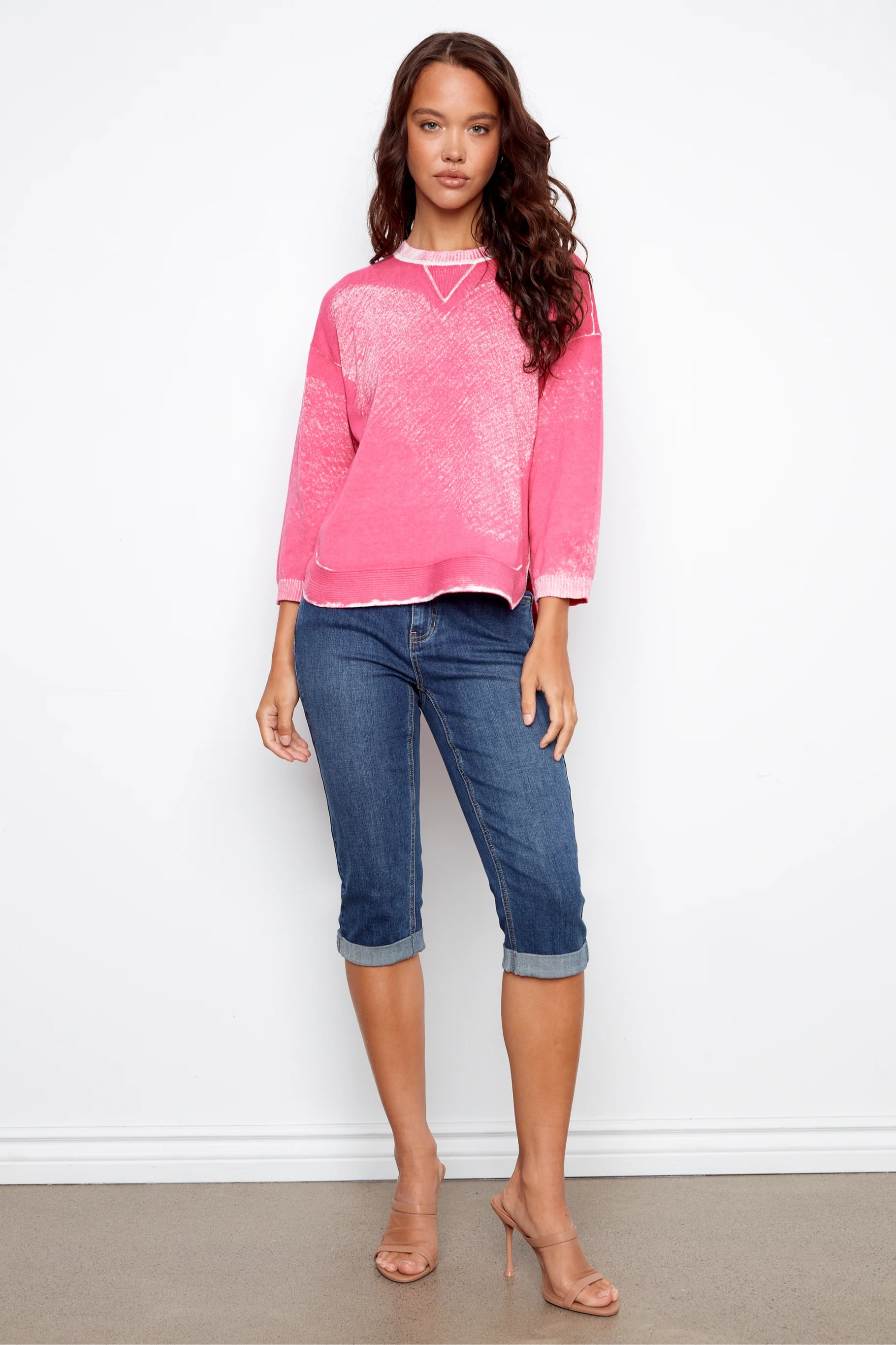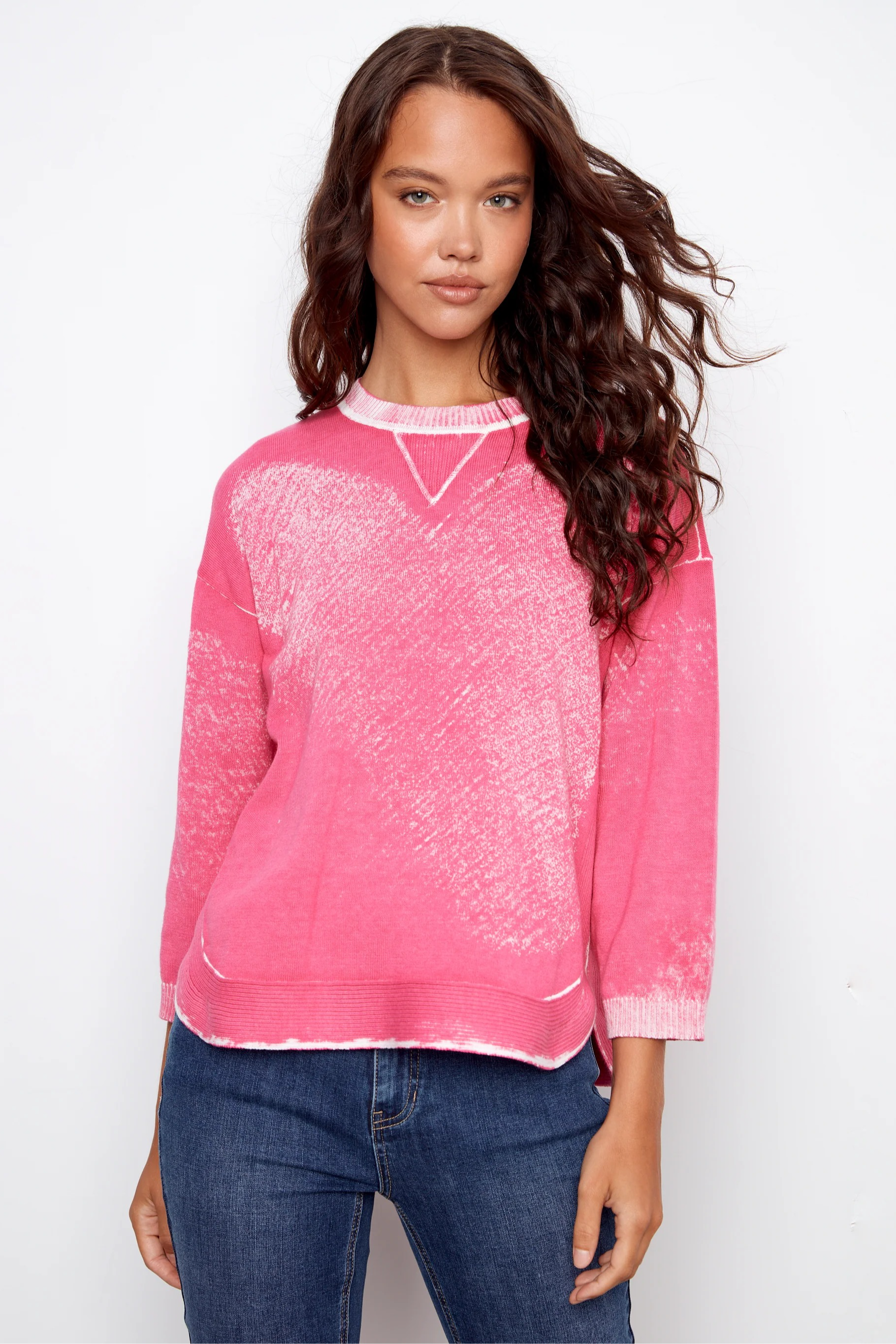 This soft pink sweater features a lightweight knit with a subtle faded finish for an effortlessly worn-in look. Designed with a classic crew neckline and a relaxed fit, it is easy to wear on its own or layered through the seasons. Pair it with denim for casual days, weekend errands, or relaxed brunch outings where comfort and style matter.