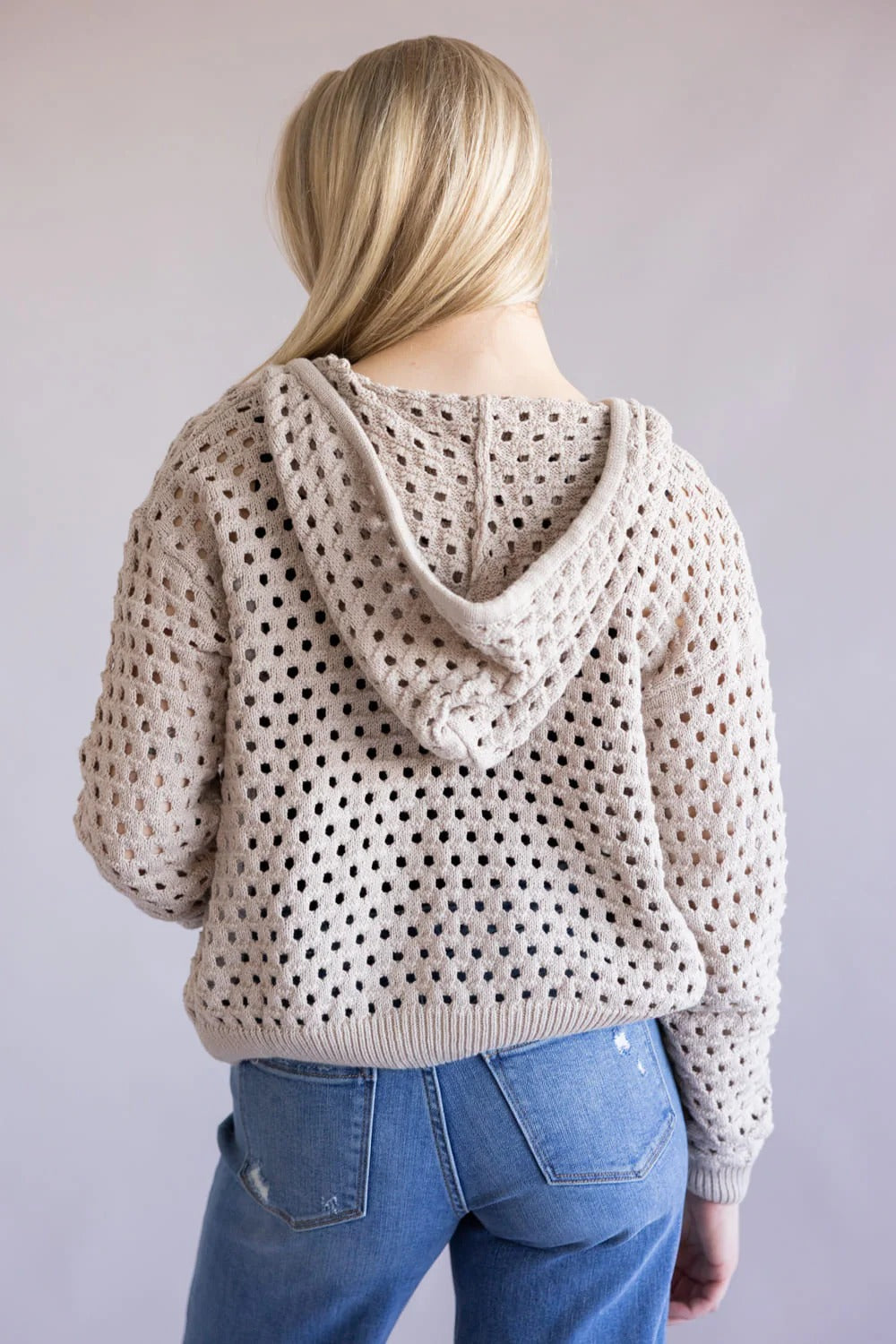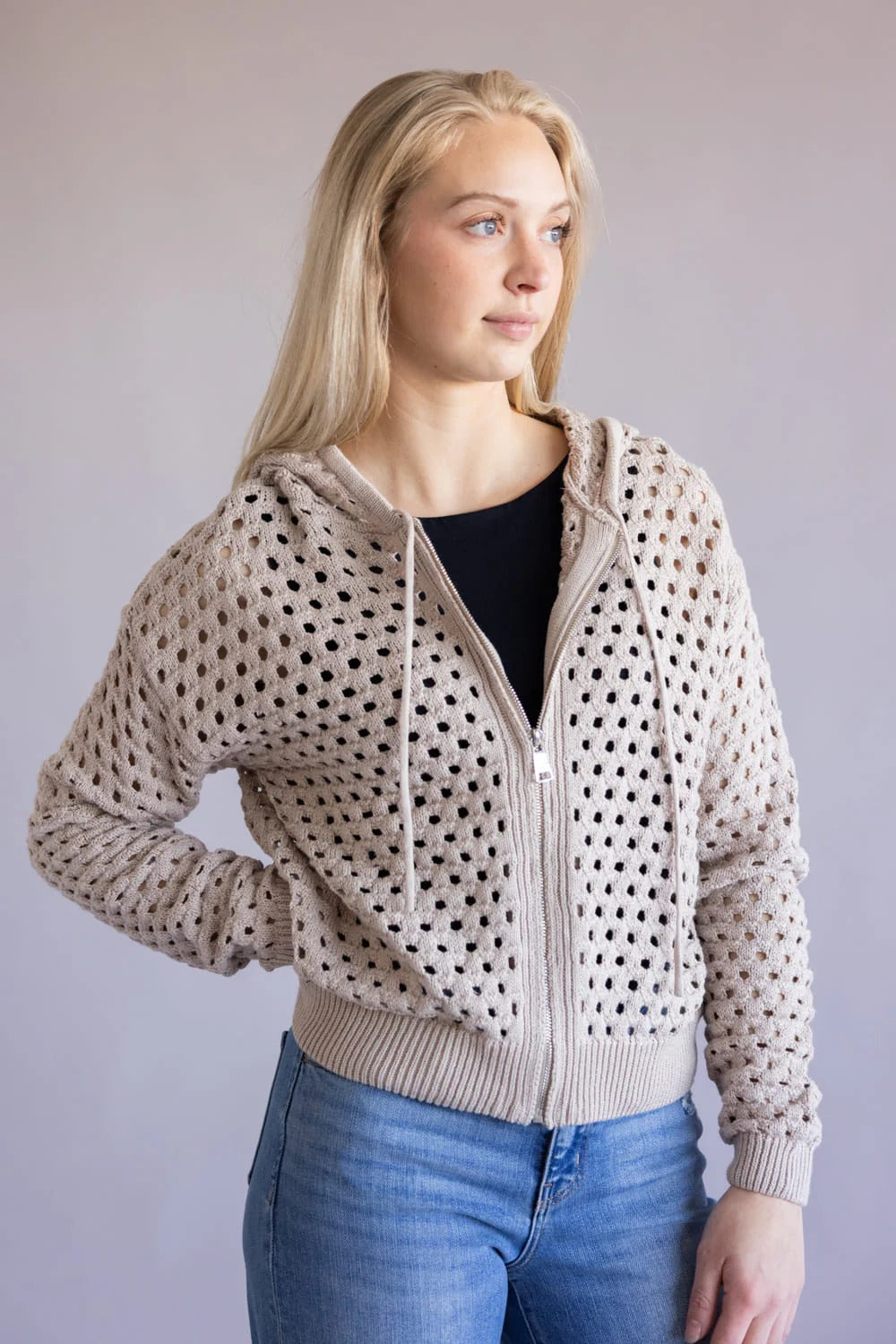 Lightweight zip-up with an open knit pattern and a relaxed hooded silhouette, perfect for layering. The Elan Sweater pairs a soft, breathable knit with ribbed cuffs and hem for a casual, lived-in feel. Elan designed this piece to be easygoing and versatile for cool mornings or cozy at-home lounging. Wear it over a tee or layered with a tank for effortless off-duty style.
