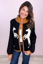 Premium style meets cozy comfort in this trendy horse knit cardigan. Designed with a wide ribbed neckline, long sleeves, and an open front with a neck closure, it offers a relaxed fit that’s perfect for effortless layering.