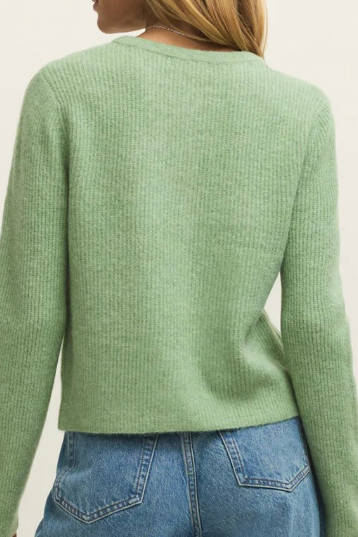 The ZSupply Medina Rib Cardigan in Appletini is a relaxed crewneck piece crafted from soft, cozy sweater yarns. Featuring an easy button-front, it’s perfect for layering over a tank or wearing on its own, making it a go-to for effortless, casual comfort.