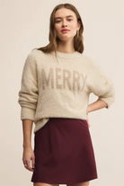 Soft metallic yarns give this cozy knit a subtle festive sparkle, while the “Merry” intarsia detail adds a cheerful touch that remains stylish long after the holidays.
