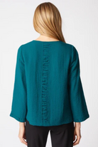 Designed for comfort and style wherever you go, this travel-friendly rayon-nylon blend features a softly textured crinkle finish. The relaxed swing shape is enhanced by ruched detailing along the front, back, and sleeves. In a rich juniper hue, it’s the perfect mix of ease and elegance.