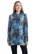 "This top features long sleeves and a softly draped cowl neckline in a beautiful blue multi-color print. It’s an easy way to add a touch of elegance and movement to your look while keeping things comfortable and effortlessly chic.