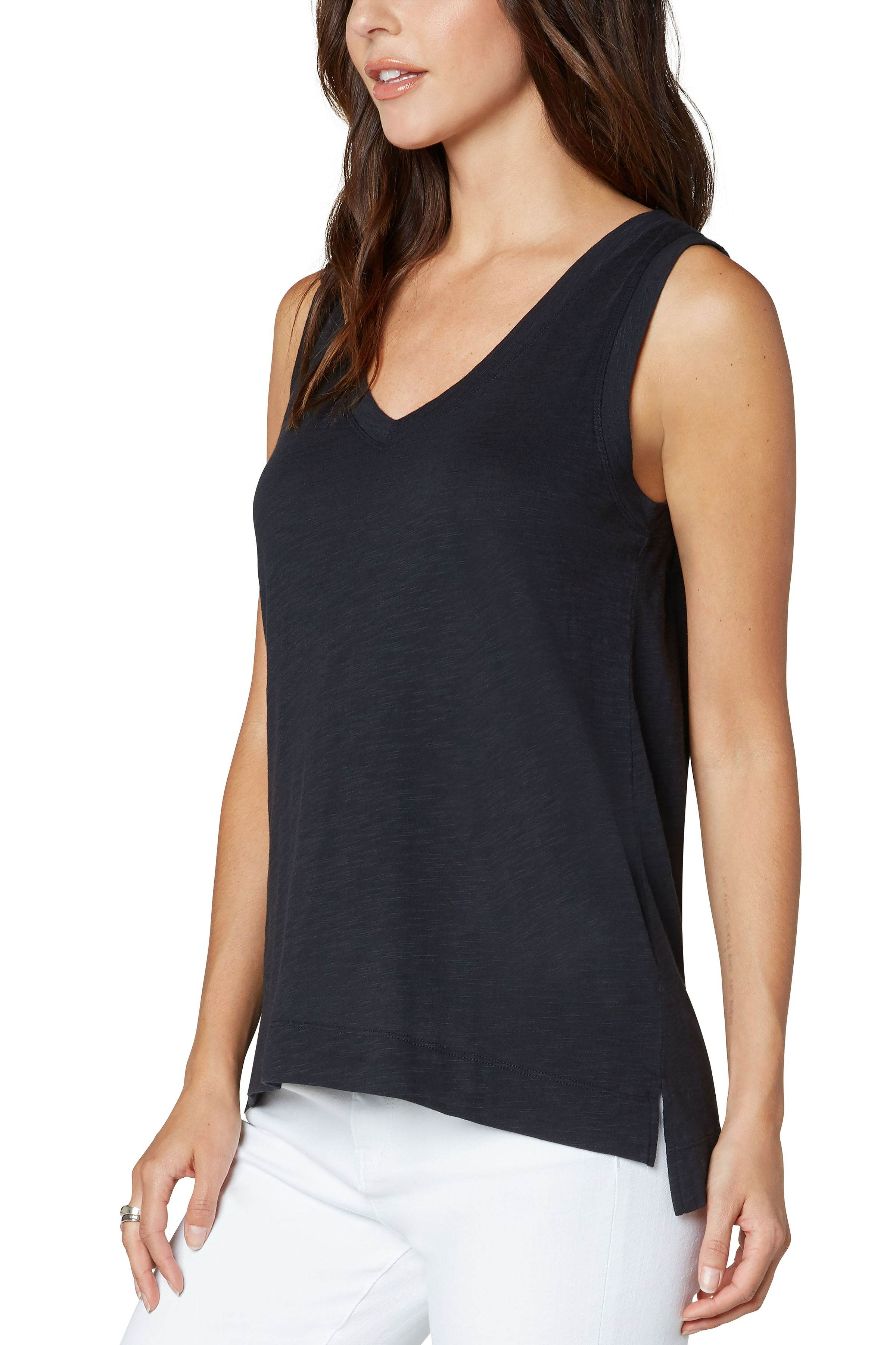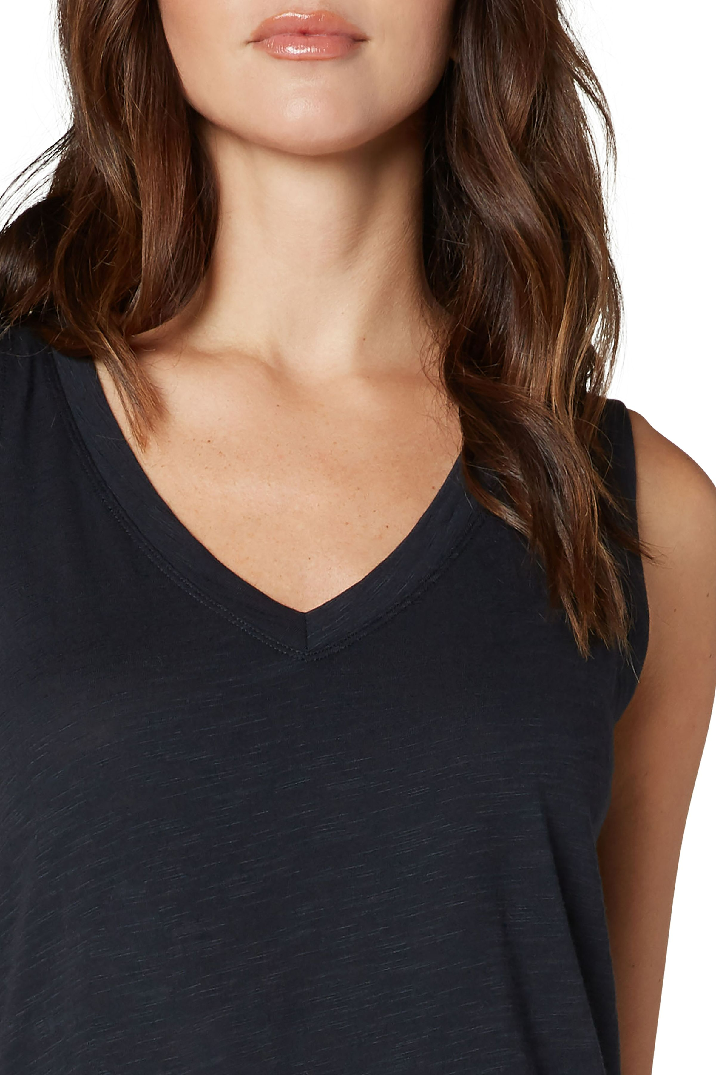 Our essential v-neck slub muscle tee is perfect for layering or on it's own! This silhouette features a high-low hem with side slits. Super easy to wear and is a timeless classic. No-brainer!