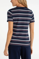 Simple yet full of personality. This striped V-neck tee blends classic navy and white with a bold fire brick accent for a fresh twist on an everyday favorite. Easy to pair with denim, tailored pants, or layered under your go to jacket, it brings a clean, modern feel to any casual look.