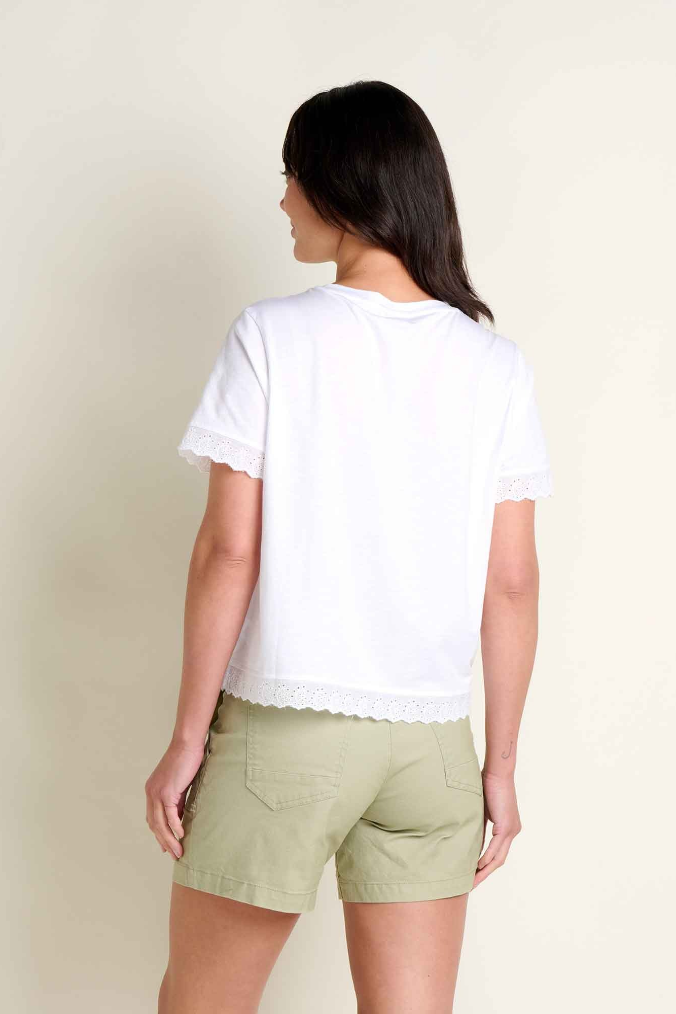 The Clara Tee is a relaxed short-sleeve tee with delicate eyelet trim at the sleeves and hem for a slightly romantic touch. Toad & Co. built this tee from soft, breathable knit for easy everyday wear. Its crew neckline and boxy silhouette make it a casual go-to that pairs effortlessly with shorts or jeans.