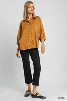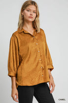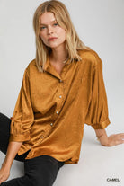 Elevate your everyday style with this Collared Button Down Shirt in a warm camel hue. Designed with a textured fabric that adds depth and character, it offers a refined yet effortless look. The button-down front and sleeve closures bring a classic touch, making it perfect for both work and casual wear. Pair it with tailored pants or denim for a polished, versatile outfit.