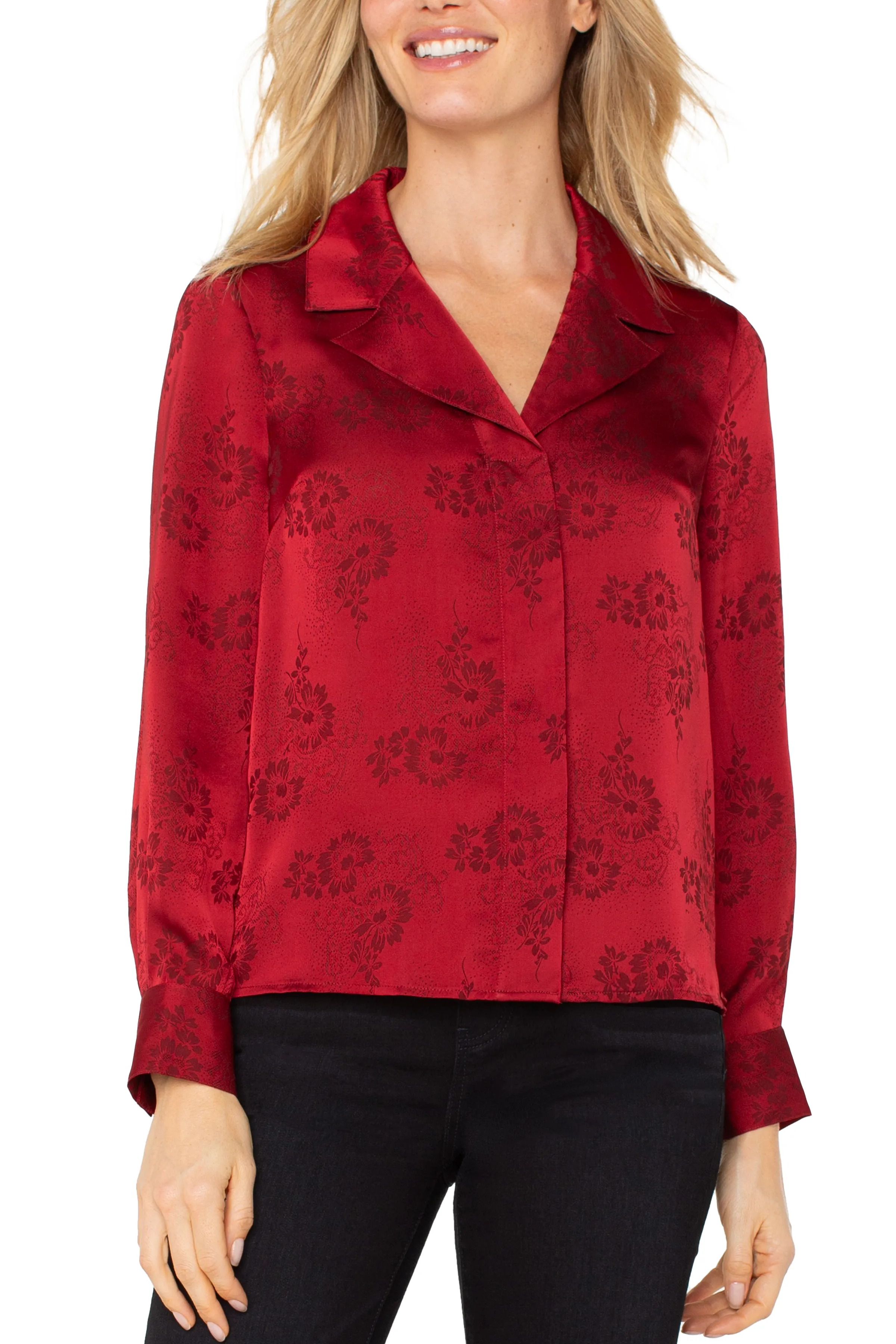 This dark red floral woven top adds subtle texture and rich depth to a classic silhouette. Featuring long sleeves, a crisp collar, hidden button placket, and cuffed sleeves, it offers an effortlessly polished look with a hint of feminine charm.