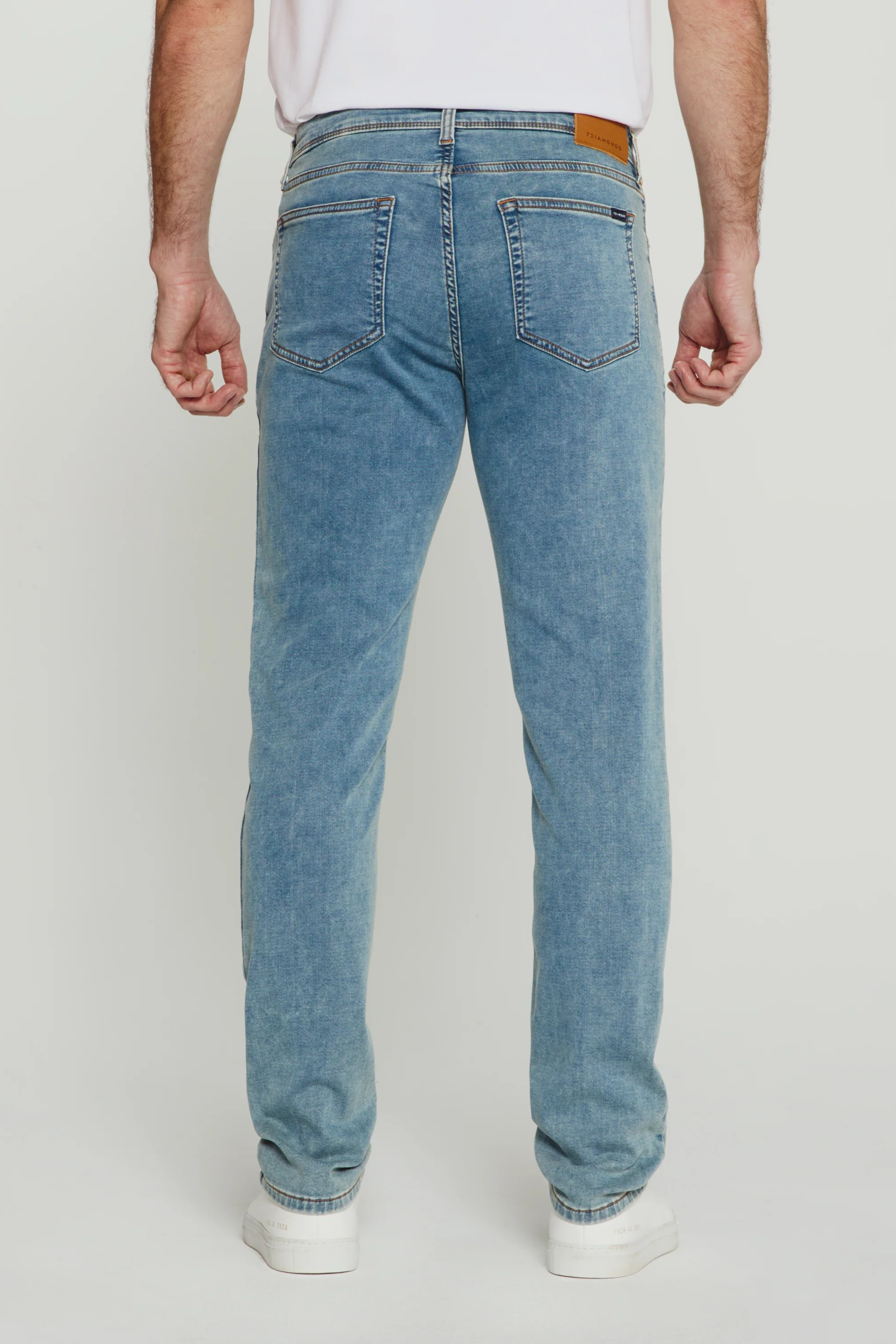 These are the Generation Athletic Fit Denim 30"—a light-wash pair of jeans cut with room through the thigh and a tapered leg for a modern athletic silhouette. The denim shows subtle fading and classic five-pocket styling for effortless everyday wear. 7Diamonds designed this pair to balance comfort and shape, making them a versatile choice for casual outfits. The 30" inseam lands at the ankle on many wearers and pairs neatly with sneakers or boots.