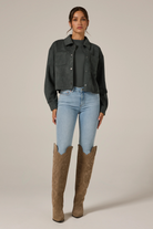 A contemporary suede cropped jacket designed with a relaxed, roomy fit for effortless comfort. Perfect for layering over a top or dress on a spontaneous night out.