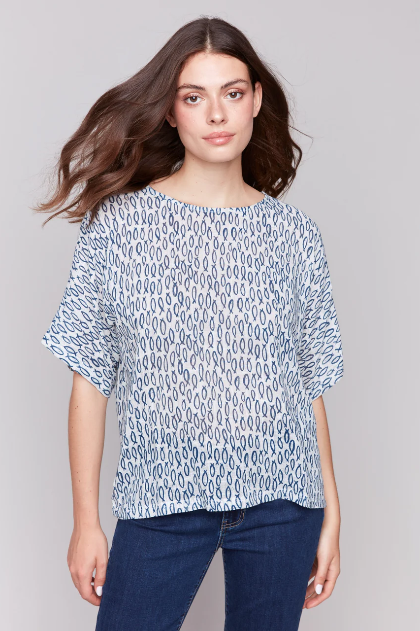 Step into effortless elegance with our breezy cotton gauze dolman blouse, designed for both comfort and style. The relaxed silhouette, enhanced by dolman sleeves and a playful fish print, pairs beautifully with the refined crew neckline. Lightweight and versatile, it's the perfect piece to elevate your spring and summer wardrobe with a touch of charm.