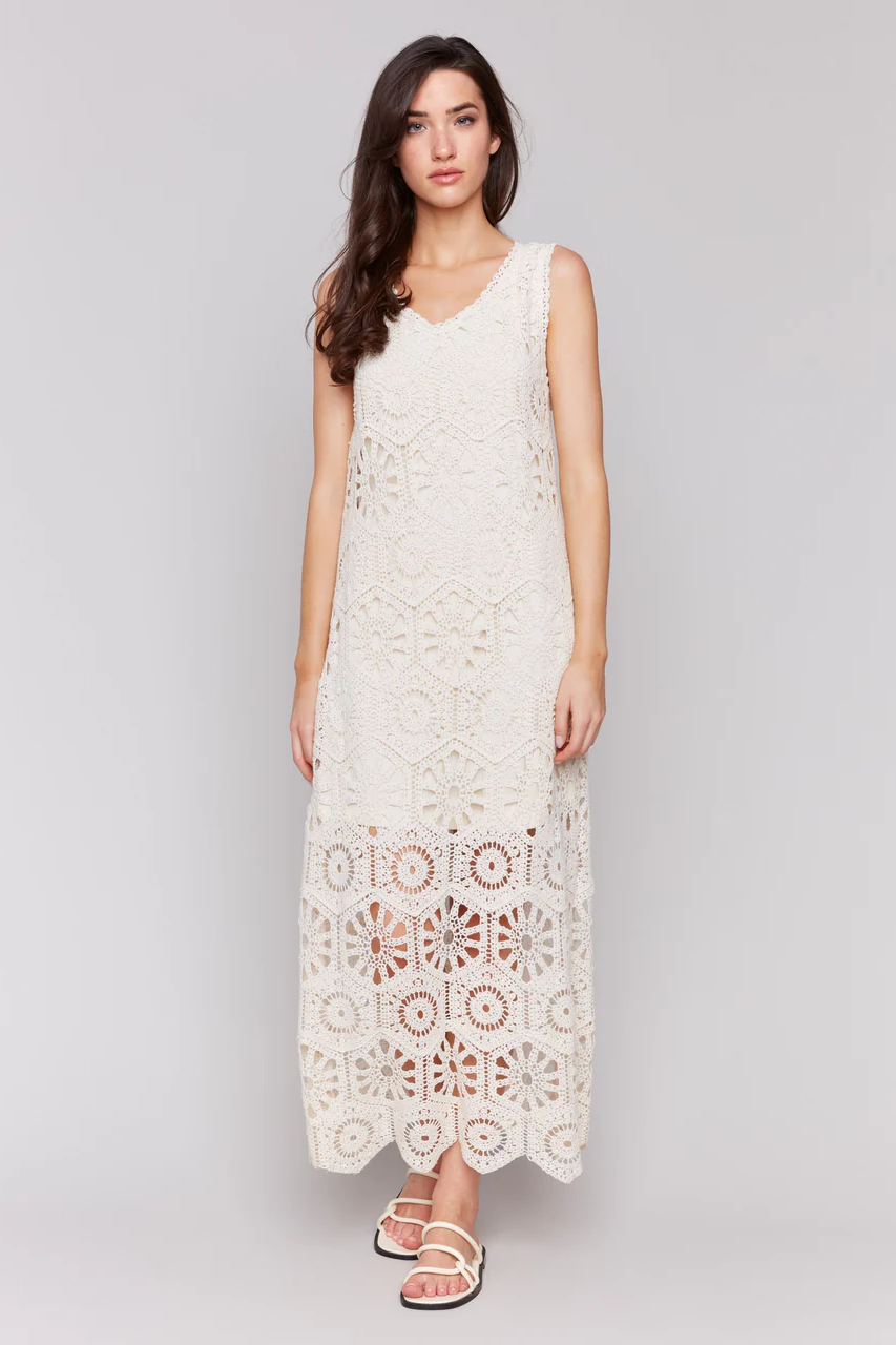 Capture boho elegance with this sleeveless cotton crochet maxi dress in a soft natural white. Perfect for sunny days and laid-back evenings, it features a modest slip and a flowing full-length silhouette. Whether strolling along the beach or attending a garden party, this dress offers effortless, chic style for your spring and summer wardrobe.