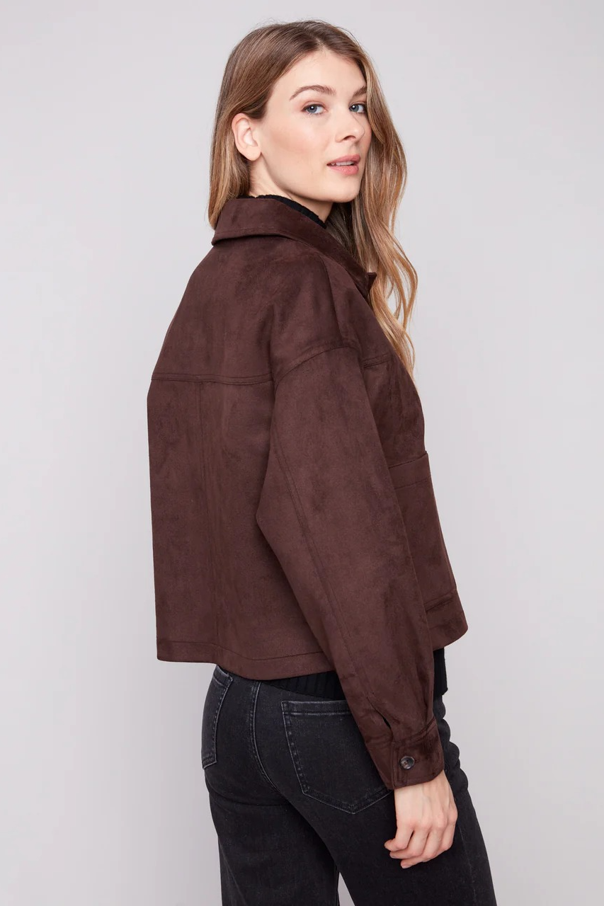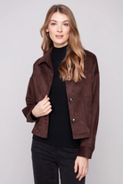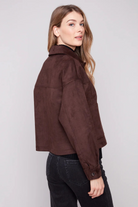 Add a touch of sophistication to your look with this faux suede jacket in rich mocha brown. The soft, velvety texture and tailored details make it the perfect layering piece for any occasion. Designed with a classic shirt collar, button front closure, and front patch pockets, it combines timeless style with everyday comfort. The stretch fabric and button cuffs ensure an easy, flattering fit you’ll reach for again and again.