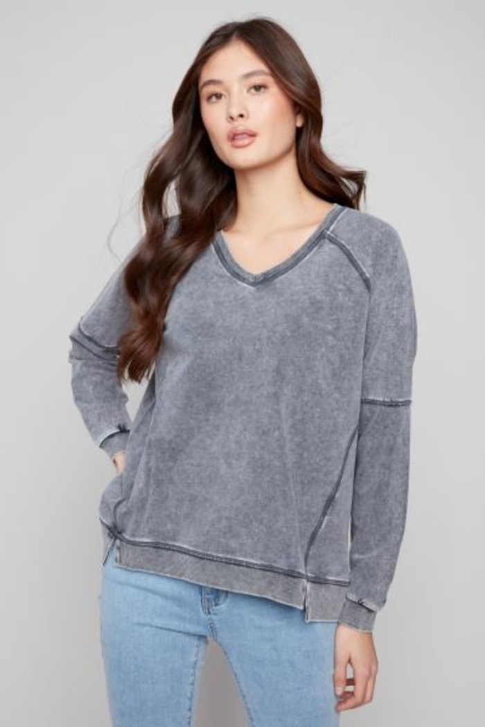 Crafted from a soft and breathable blend of 95% cotton and 5% spandex, the Charlie B C1407 Cold Dye French Terry Top offers gentle stretch for all-day ease. With a 27" back length, it strikes the perfect balance between style and coverage. Designed with a relaxed V-neck and raglan sleeves, it's your ideal choice for laid-back travel days and easy outfit changes. Whether you're on the go or taking it slow, this top delivers comfort with a playful touch.