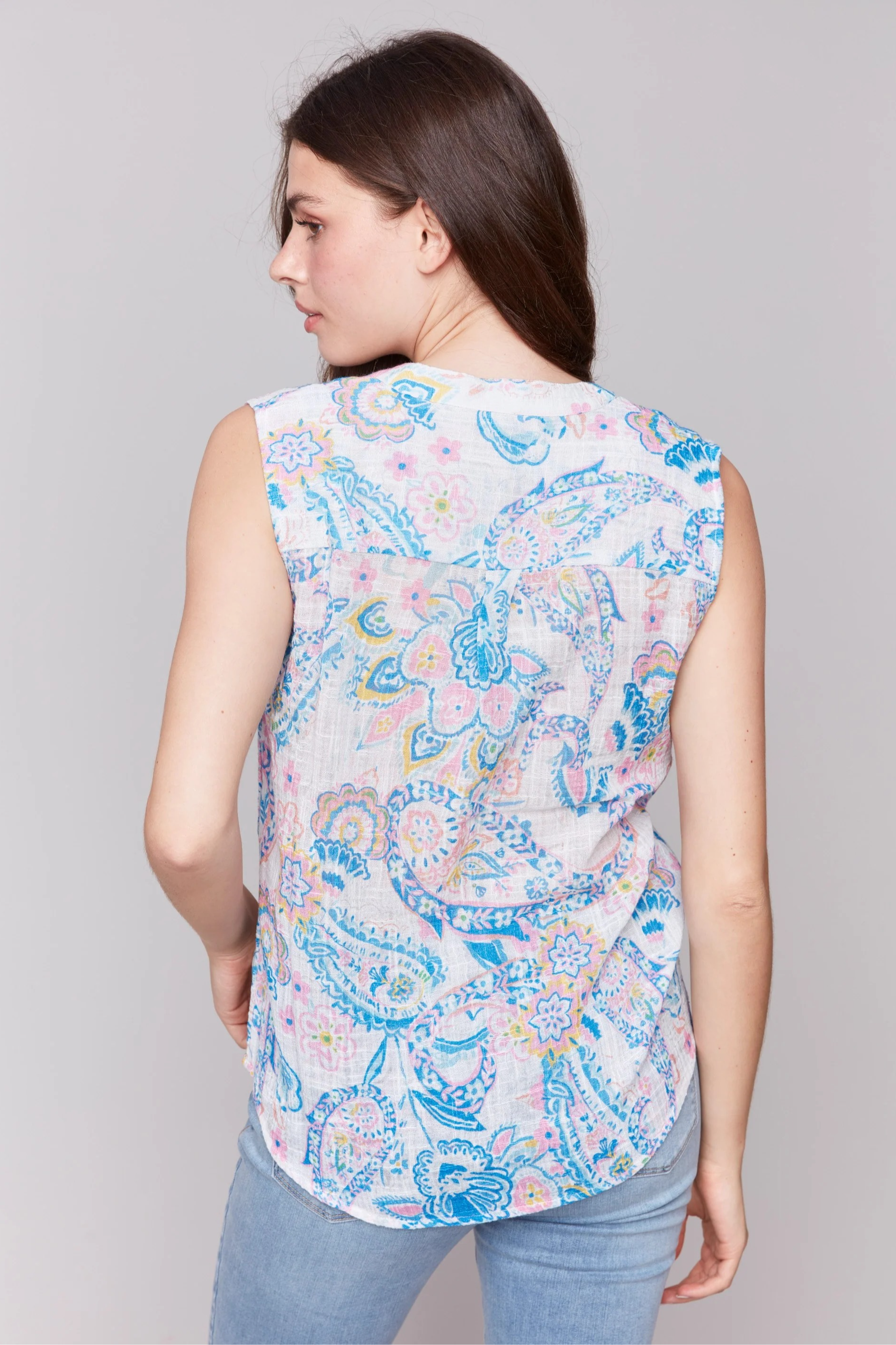 This sleeveless top, made from soft cotton gauze, showcases a boho-inspired paisley print and offers breezy comfort all season long. Designed with a high-low hem and a convenient chest pocket, it blends laid-back style with everyday function—ideal for sunny outings or relaxed weekend brunches.